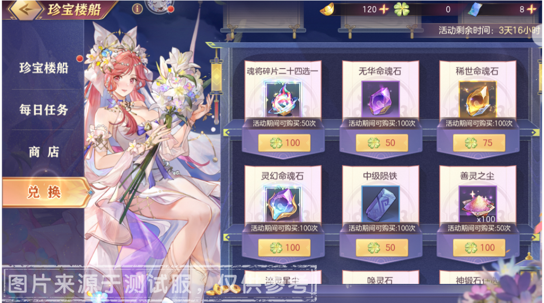 每次觅宝必定获得「四叶草」*35,可消耗「四叶草」进行魂将碎片二十四选一、灵幻命魂石、稀世命魂石等豪华奖励兑换。