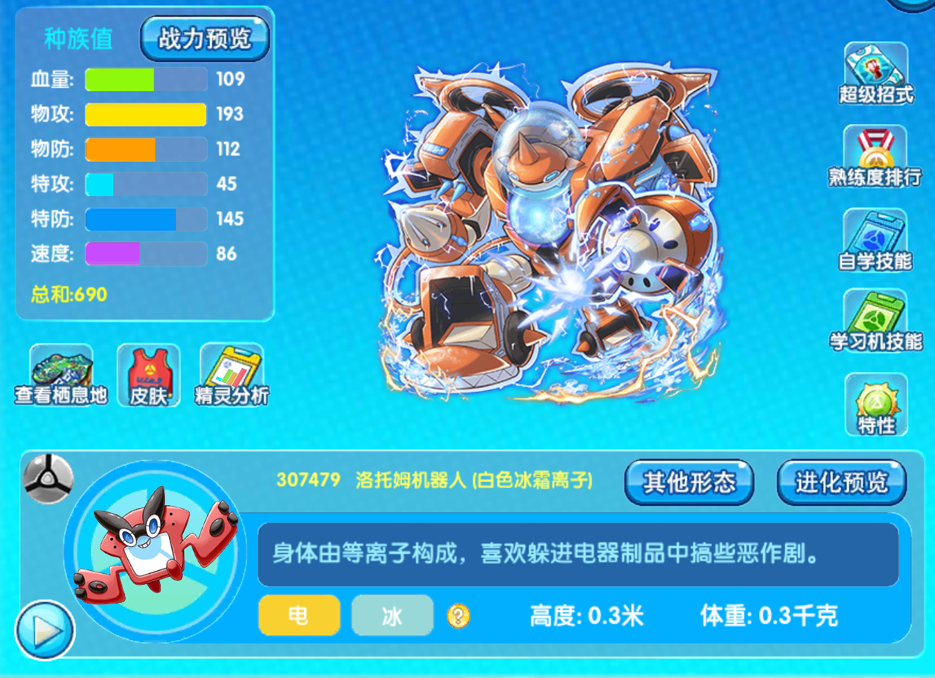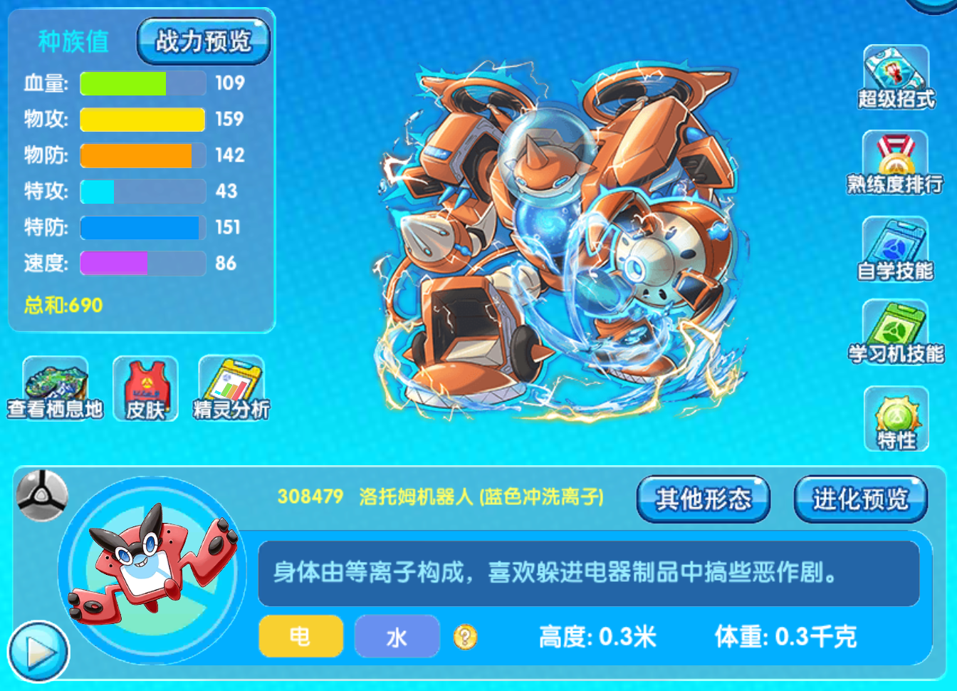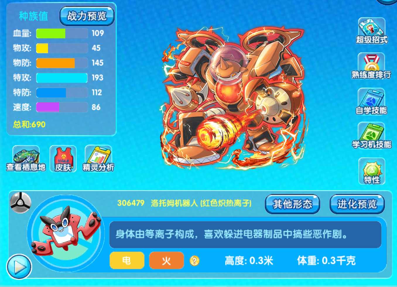 那么最后一个心态就是机器人,五个形态里面整体能力最强的一个,虽然说水电机器人是一个辅助类型的宠物,但是自身的辅助能力别提有多强了,能够学习交换伏特不怕被抓,而且自身特性,使用任何技能都可以将对面25%的概率陷入麻痹状态,而且自身也可以学习清除浓雾,所以一开始这个形态的机器人使用的玩家非常的少,但是到后来高端局的宠物攻击力越来越高