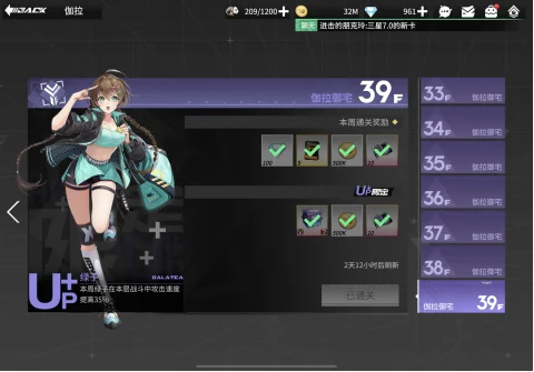 如上所说,在12月18日更新后,御三家开放了久违的39层。和之前的层数不一样的是,这个39层每周会更新,并且不能扫荡。每周第一次通关会给100钻石、5个金色装备强化材料50万金币以及10个二阶加固材料。整体来讲收益还是不错的,因为分三家因此相当于每周多白嫖了15个金色材料。