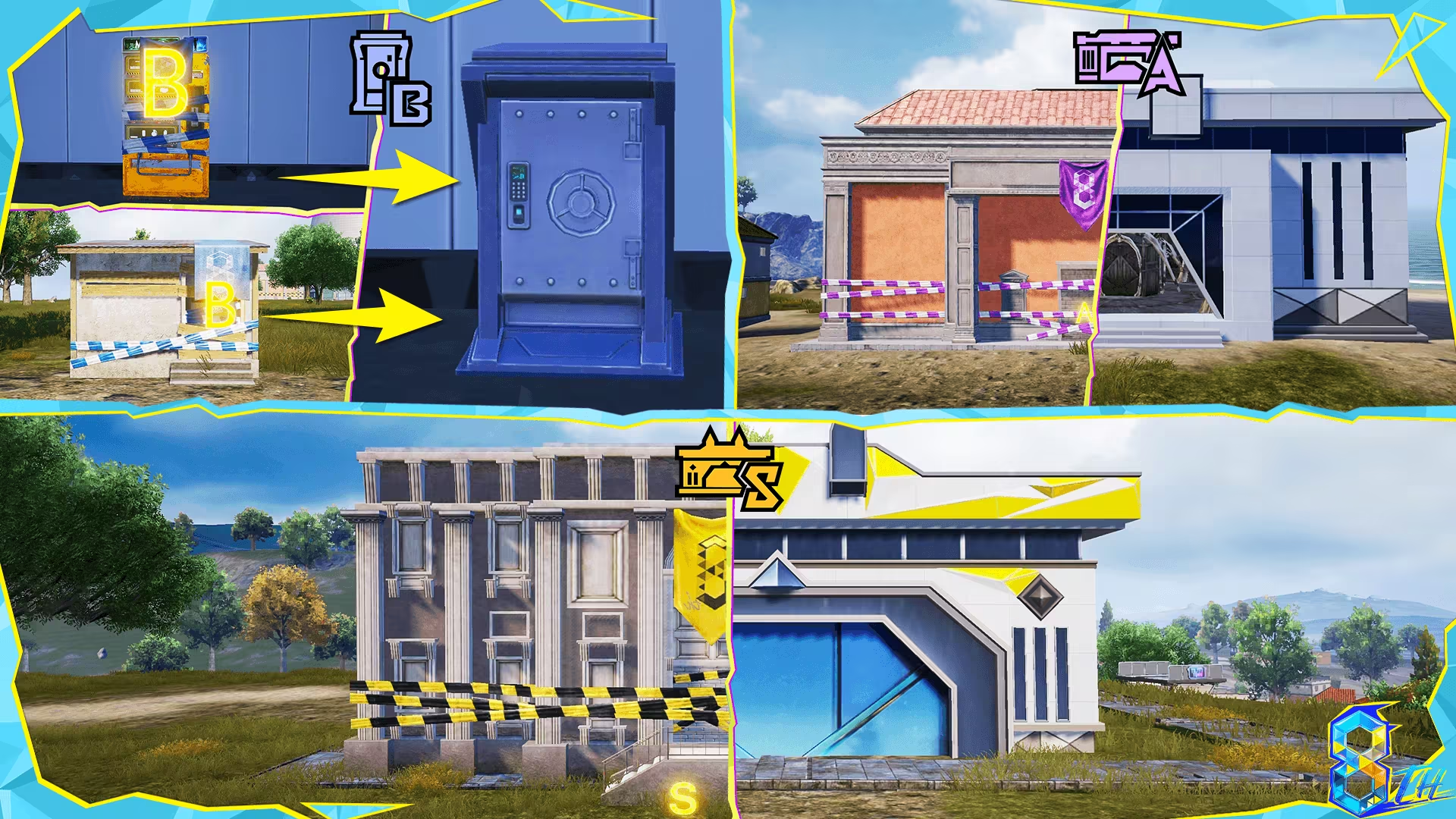 ●S级宝库:经典Erangel主题;与沙盘互动可预测下一个安全区位置,并使区域内天气变为雨天。宝库内的展品均可互动以触发特殊效果,获得额外奖励。此外还设有军火室,提供高级军需物资。