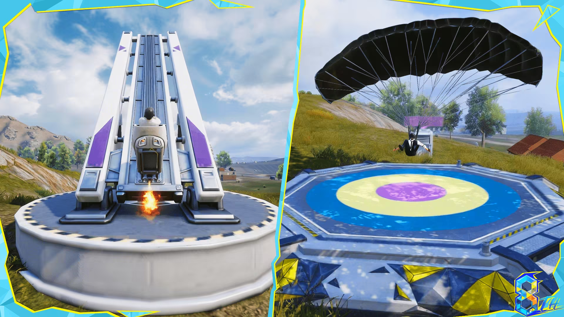 ✧ 地图上新增多个跳伞挑战点。玩家可以利用特殊的升空装置一跃而起,在空中展开滑翔,精准降落到靶心平台,就可以获得物资奖励。
