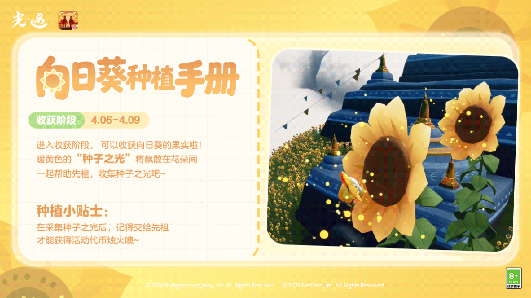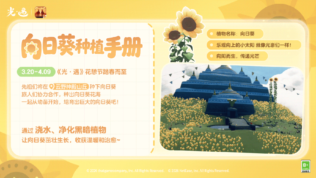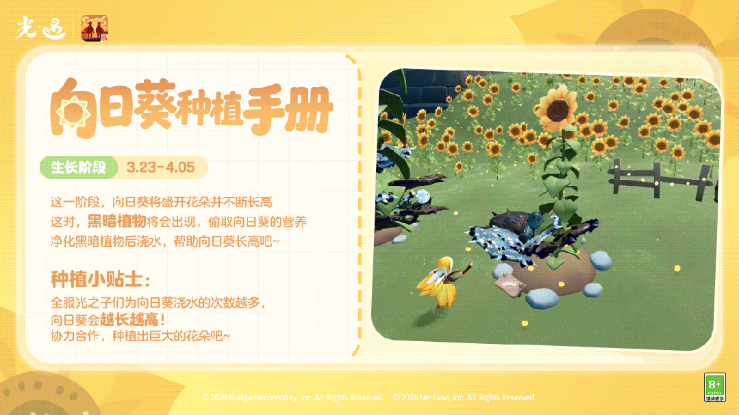 光之子们,准备好一起种太阳了吗~是泽哦发布于 03-12关注幼芽初醒,等待一汪清泉的灌溉手捧烛光,净化蔓延的黑暗植物待葵海翻涌,收获一抹春日暖阳🌻《光·遇》花憩节将于3月20日开启趣味向日葵种植玩法即将上线经过光之子们的精心照料向日葵将越长越高!让我们携手种出向阳而生的金色海洋吧~