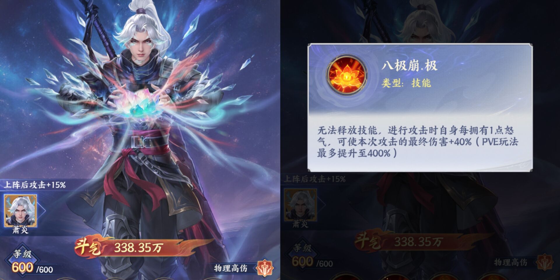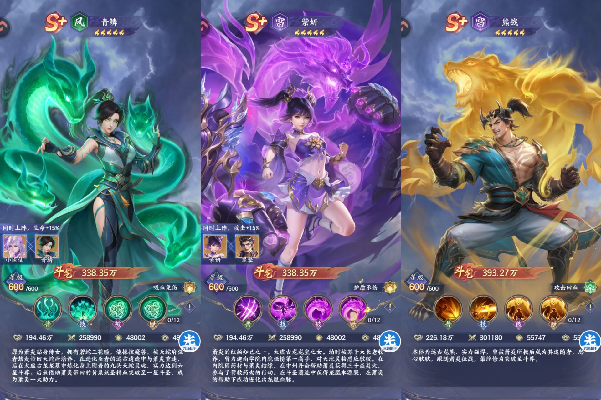 其实有条件的大佬是可以氪的,毕竟输出不低这个游戏爬塔什么的还是很缺输出的,普通萧炎伤害上限非常高,可以配合【传说萧炎】打伤害,配合减防斗技普通萧炎爬塔伤害非常稳定伤害也高。