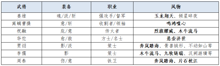 2、T风物:t位主要为贾诩及周泰,推荐奔岚踏海或片石枕江。
