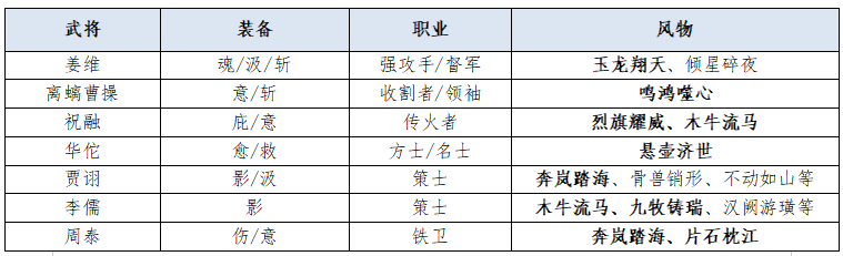 其中,sp曹操固定鸣鸿噬心,姜维可用玉龙或者倾星,华佗固定悬壶济世。