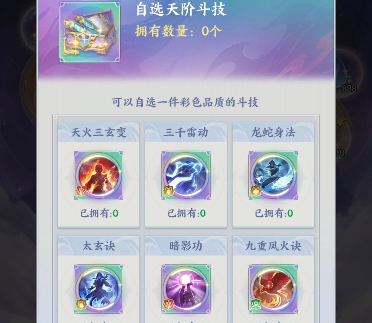 7:【自选天阶斗技】优先选择思路。答:玄机铠、三千雷动、龙蛇身法、天火三玄变、九重凤火决、幻魂身法。