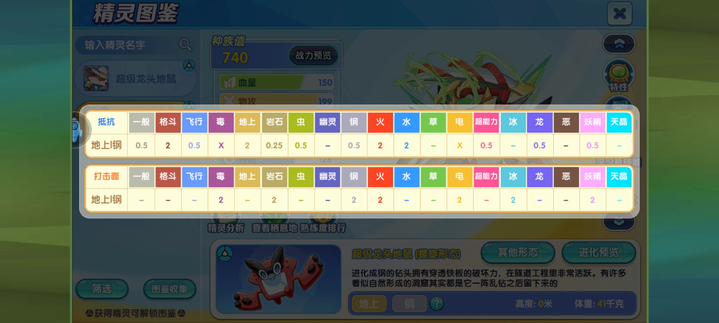 地加钢属性让龙头地鼠获得不错的打击面,抗性上地钢两倍弱格斗、地面、水、火,两倍抵抗妖精、龙、超能、钢、虫、飞行、普通,四倍抵抗岩石,免疫毒和电,可以看出属性抗性也非常优秀,尤其是免疫毒与抵抗岩石、普通,这就让它能在较小损耗下吃这些属性伤害,还不怕切上来被毒,抵抗层面来看,龙头地鼠拥有的属性抗性很多弱点很少,特别在当今的对战环境下,暴力的输出宠很多,能有效抵抗主流攻击属性精灵的攻击,也不容易被一击秒杀,生存力很强,在打击面层面上看,龙头地鼠有着优秀的打击面,双本能造成至少2倍克制伤害的属性有毒、岩、钢、火、电、冰和妖精高达7个,尤其常见的地面、妖精,都能给予这些系别的精灵可观的伤害。