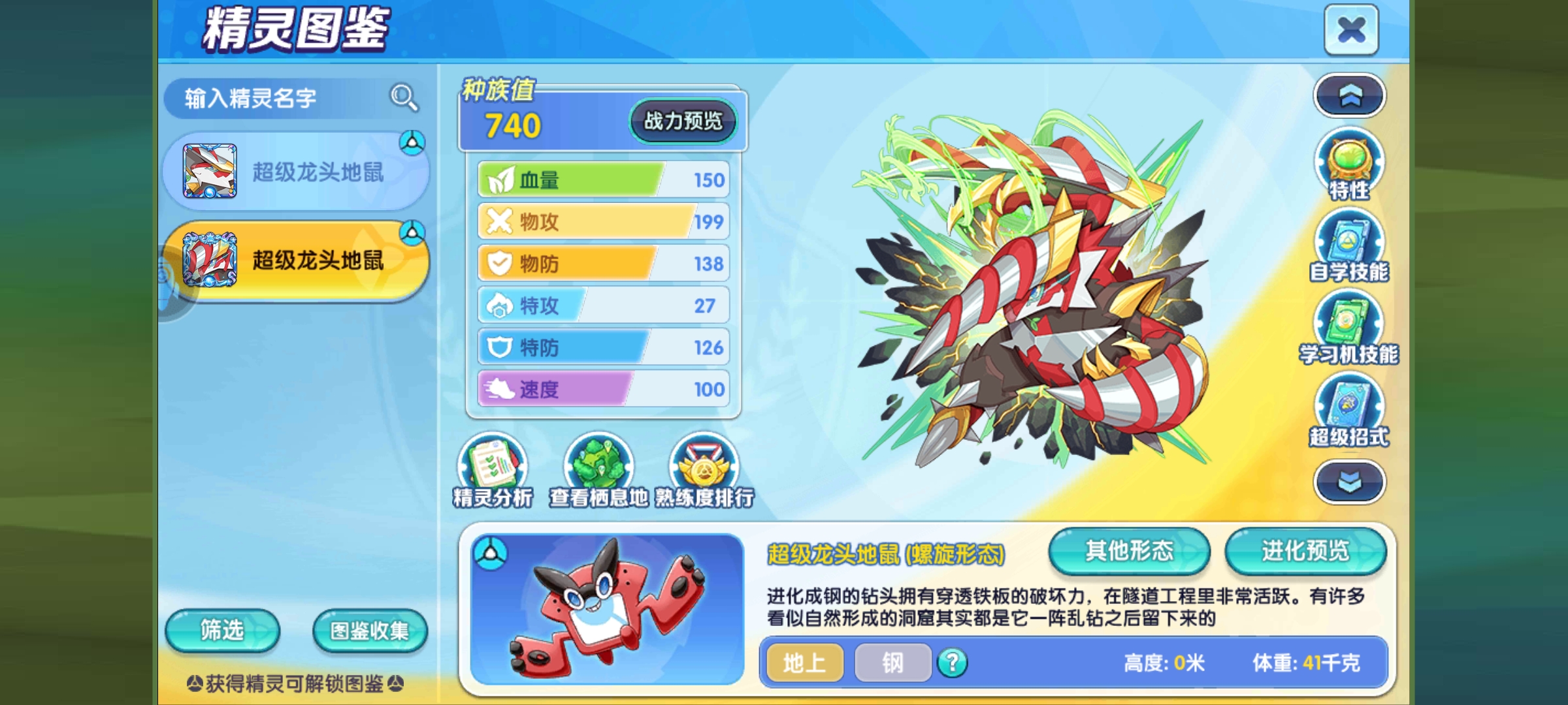 从龙头地鼠的种族值来看,其中较高的物攻值199可以挤进第一梯队,虽然不是两百多的那种变态,但也属于超高水平,它有着不错的血量达到150,还凑合的双防138和126,从面板上看,速度只有100点,看上去非常的弱势,但是这并不是问题,由于特性可以铺设天气获得速度翻倍,因此它反而可以以100的速度获得先手优势,龙头地鼠的耐久三围让它抗伤能力不是很高。但是输出方面可一点也不弱,可以看出,作为一个输出手绝对处于版本上游,毕竟是999新出精灵,不能显得太拉胯。此精灵我是建议配合队伍走站桩输出或者墙角收割,新特性加持下输出伤害有保障,整体来说相当舒服。