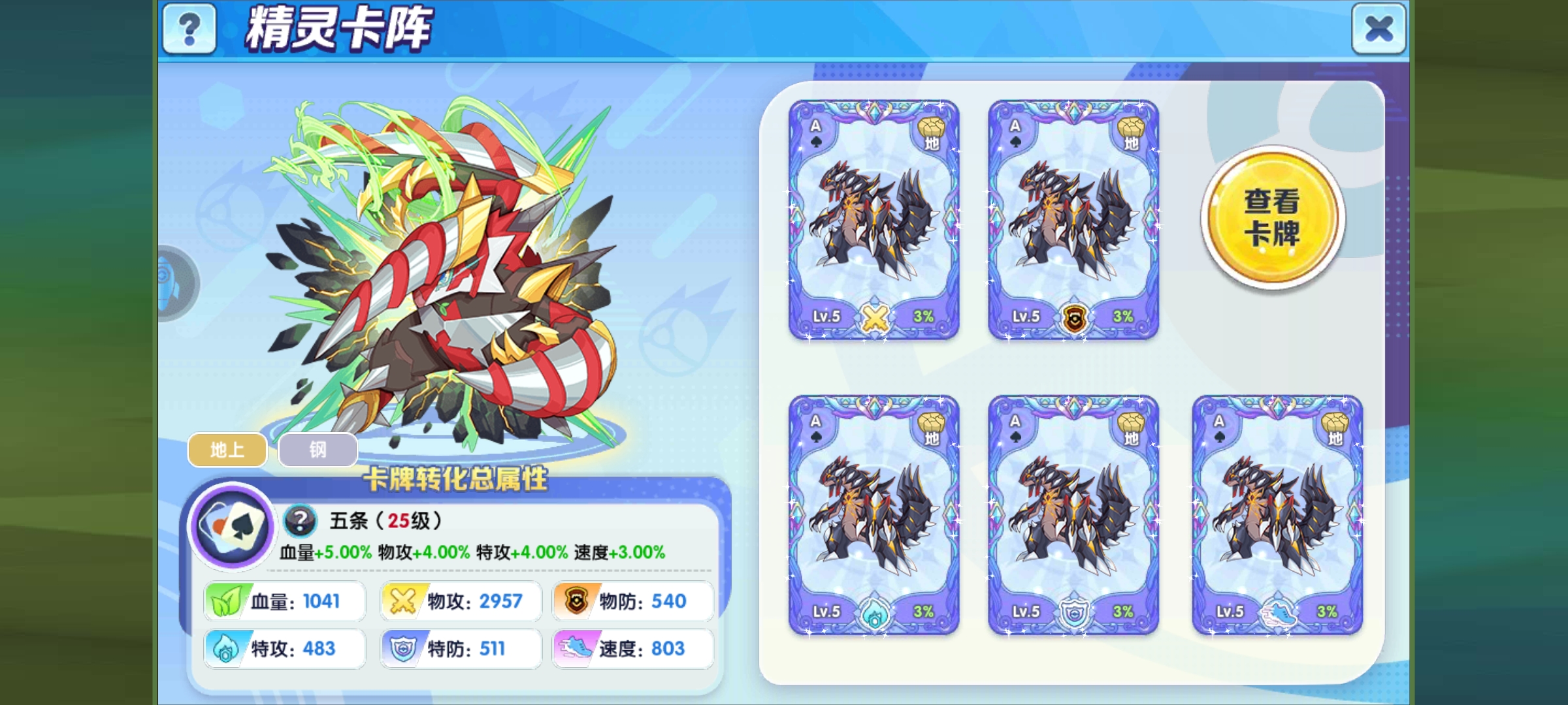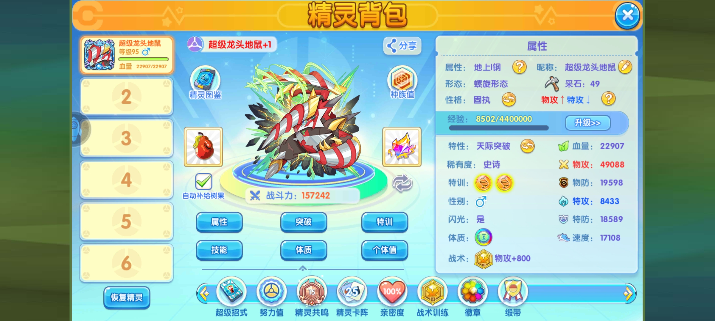这个面板现在来看也不错,速度在特性加成下也挺快的,物攻都快5万了,相对来说双防挺低的,即便有减伤作为一个高输出宠,也不指望他有多能抗。