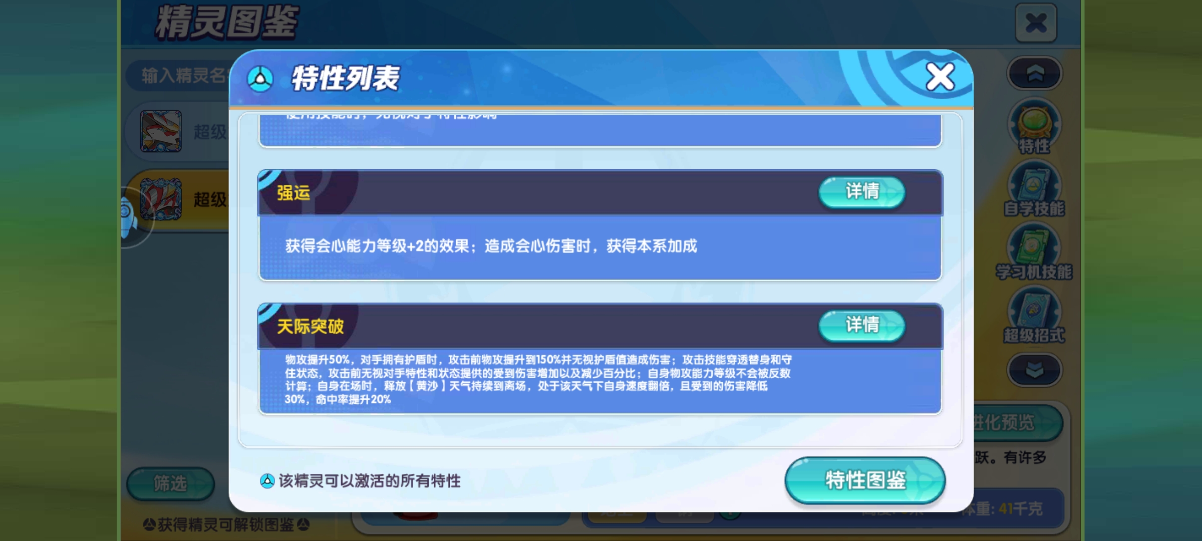 大家首先请看特性介绍的天际突破,这是是新特性,效果首先是物攻提升50%,然后对手拥有护盾时,攻击前物攻提升到150%并无视护盾值造成伤害,完全就是为破盾准备的,不管是钢柱子还是日月布都要被针对,即便超能的盾也不能幸免于难,然后攻击技能穿透替身和守住状态,就是让对方无法联防,不能依赖守住和替身拖延回合来打消耗战,自带穿透功能,还有一点也是攻击前无视对手特性和状态提供的受到伤害增加以及减少百分比,就是那些依赖特性提供减伤加伤的宠物我被龙头地鼠克制,简直究极缝合怪,但是这还没完,自身物攻能力等级计算不会受对手影响,蛇姐也降不了。