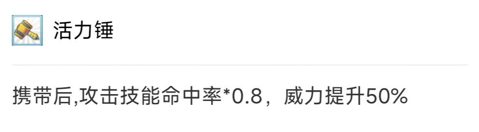 活力锤也可以,这个道具从出来后,只有特定宠物带着,因为它虽然加成给力,直接增伤50%,但是降低命中,但是龙头地鼠特性黄沙补充了命中,也没触发它的天气造成必中无效的负面buff,不过因为我还带双刃,所以就没带这个,而且活力锤带了战力也会增高,容易匹配宇宙队。