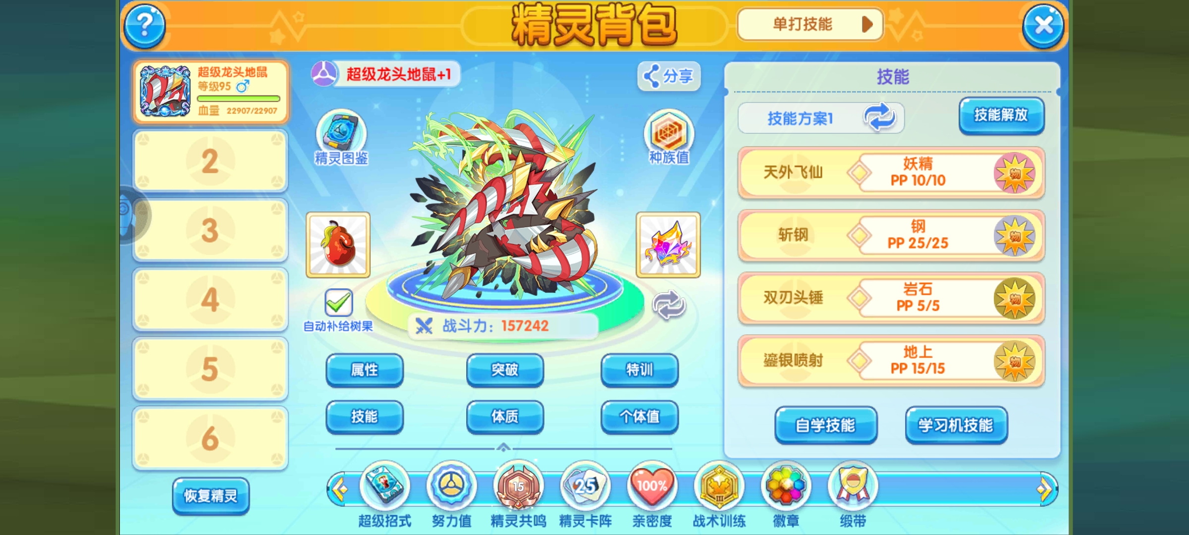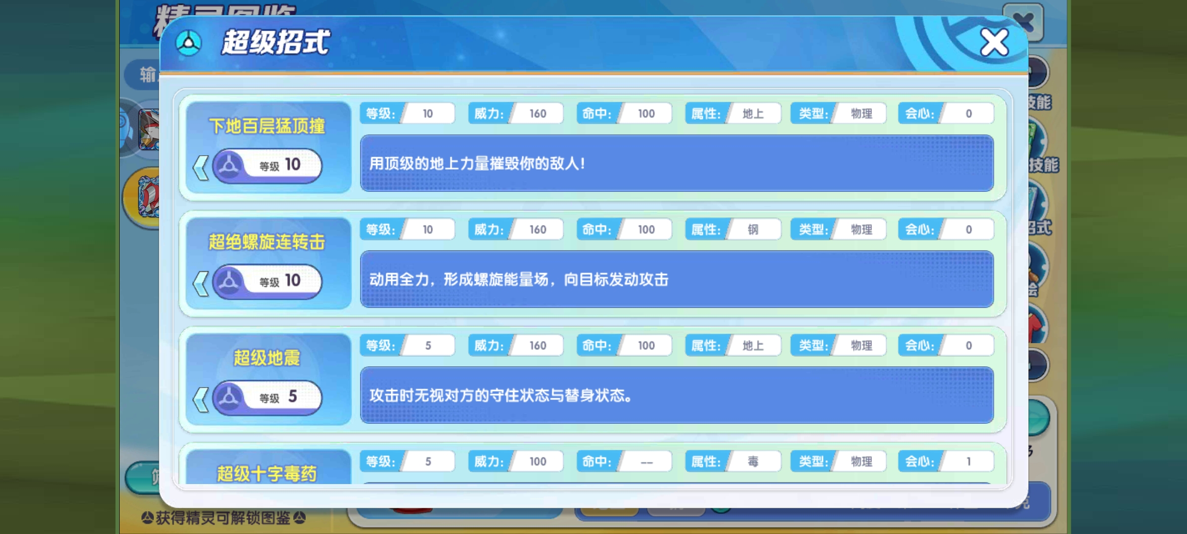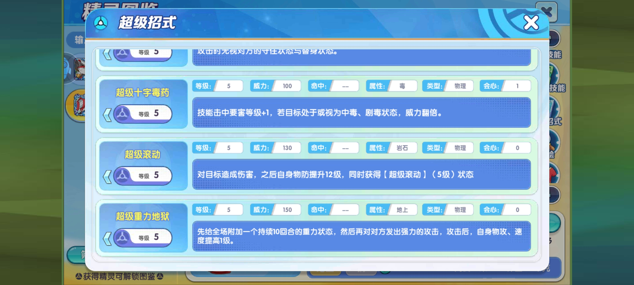龙头地鼠的超级招式有6个,但是因为玩法关系,只推荐超级重力地狱,效果是先给全场附加一个持续10回合的重力状态,然后再对对方发出强力的攻击,这样即便对方是飞的也能打到,攻击后,自身物攻、速度提高1级,这个超级招式主要有两个功能,一是打游击时迅速处理掉对面的飞在天上的联防、骚扰精灵并收割比赛,150的强力威力收割场上残余精灵也不难,二就是给队友铺路,如果是地面系队友,后续可以给他们也提供不错的输出环境,不让飞行系无脑联防。