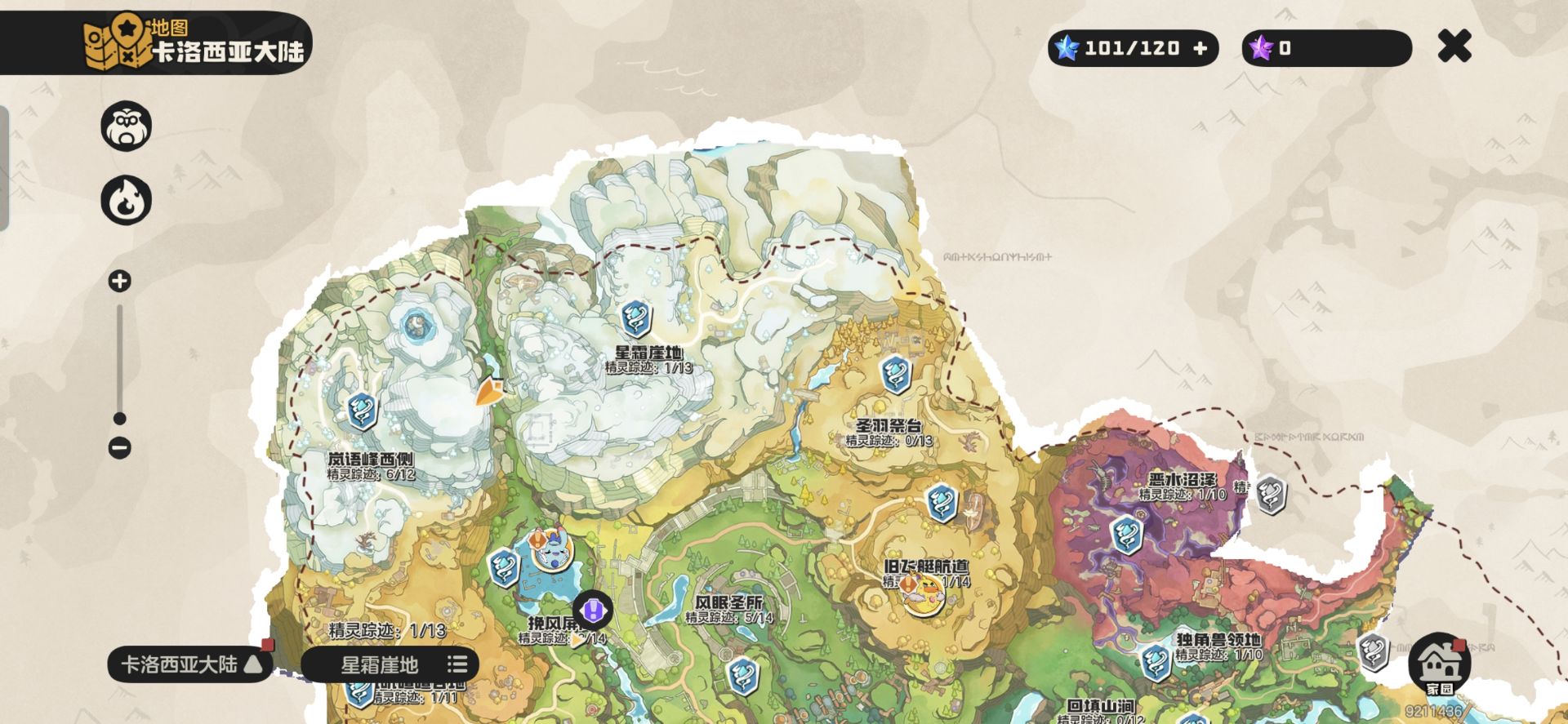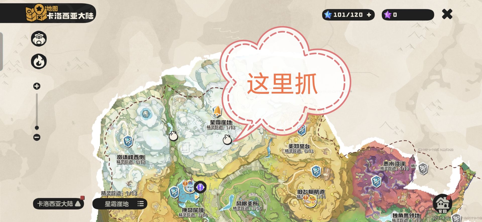 ①抓取地点:【星霜崖地】看狮子标记的地方