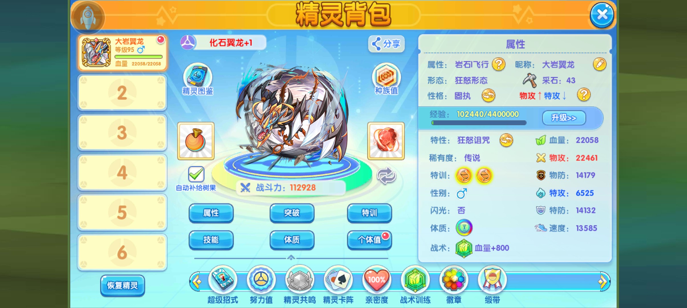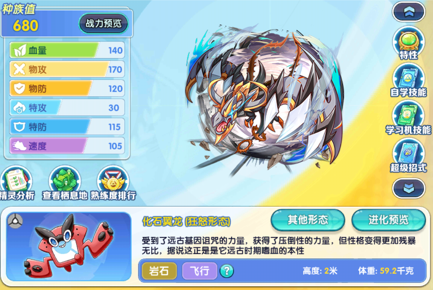 那么一开始我说的速度种族为什么那么低?主要都是转移到特性方面提速了,大家可以看到狂怒状态每一层都可以增加20%的速度,那么,上限是六层就可以提供120的速度提升,这个速度线虽然不是一线速度,但也是逼近一线速度了,如果化石翼龙的努力和性格都是开朗的话,那肯定就是一线速度,闪光形态的话那就更不用说了会更快的,但是我个人感觉努力这方面还是用这个血量和物攻的努力更好,这样的话又肉又能打。