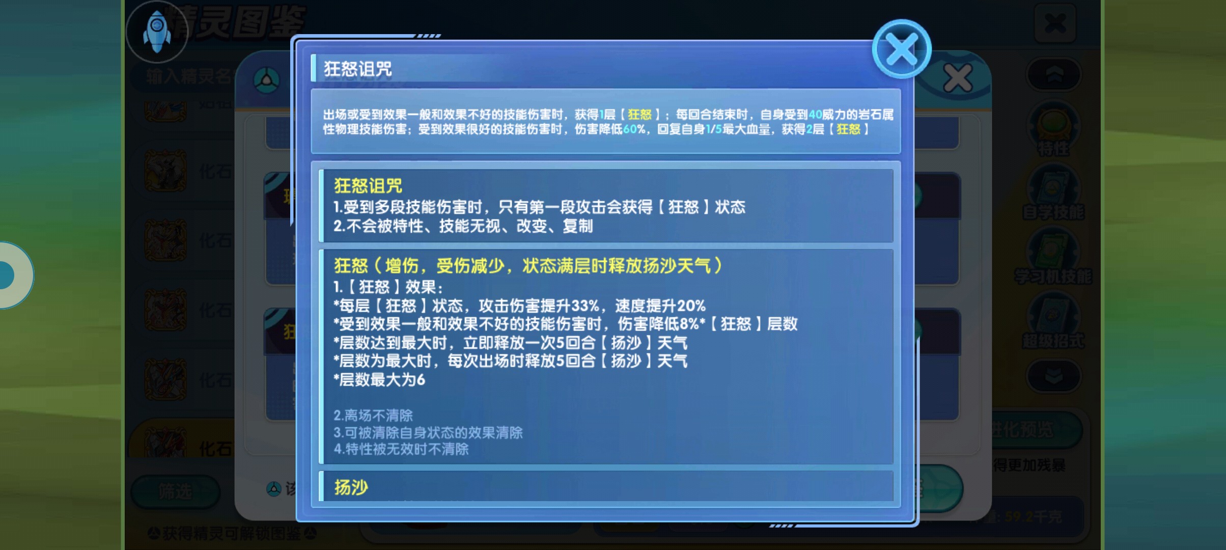 特性的话叫狂怒诅咒出场,或者是受到伤害的时候,无论是受到克制还是受到效果不好,那么都可以增加狂怒状态,在这种状态下,自身可以提高速度和攻击力,同时也可以开天气,这个天气还是那个最老的天气种类扬沙,不过呢,这里有一个副作用,那就是每回合结束的时候自身会受到一个岩石属性40威力的直接伤害,这是自己打自己,之所以给这么一个设定机制,就是为了方便触发狂怒状态,还有回血,因为后续的回血效果是必须要受到克制伤害才能够回血,那么有了这个狂怒机制,自己打自己岩石克制飞行,那么就可以触发回血效果,回复1/5的血量,那么有人可能会说了,自己打自己对面也克制,那岂不是暴毙了?别忘了,前面还有一段话叫减伤60%,这个减伤比例还是蛮高的,大家可以想一想,之前的这个张焕火就知道了,那个减伤比例和这个减伤比例是一样的,不过呢,区别就在于这个减伤比例是只能够克制才行。