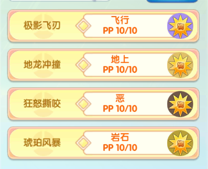 由于自身的特性,可以回血,那么在技能方面和道具方面的话,回血这一项可以忽略掉了,当然了,如果想用技能回血的话也行,但是我还是那句老话,现在这个游戏能不用技能回血的,就不要用技能回血,因为这太拖节奏了,容错率也不是特别好,所以,在技能方面呢,我是直接推荐了四个攻击技能,首先就是这个极影飞刃,这个技能还可以封锁对方的道具,可以给对方挂上道具封印状态,这样的话,对方的减伤道具或者是果子,也就用不出来了,琥珀风暴的话,主要是根据自身天气来进行伤害提升的,自身的天气越多,威力就越大,当然了,也可以考虑落岩封锁降速,地龙冲撞的话,主要是补充打击面的同时能够降低对方的攻击等级,但是要克制对方,才能够降低,否则降低不了。至于狂怒撕咬的话,主要是给对方增加咬伤,而这个技能大家也都知道,越打越痛是一个小节拍器效果。