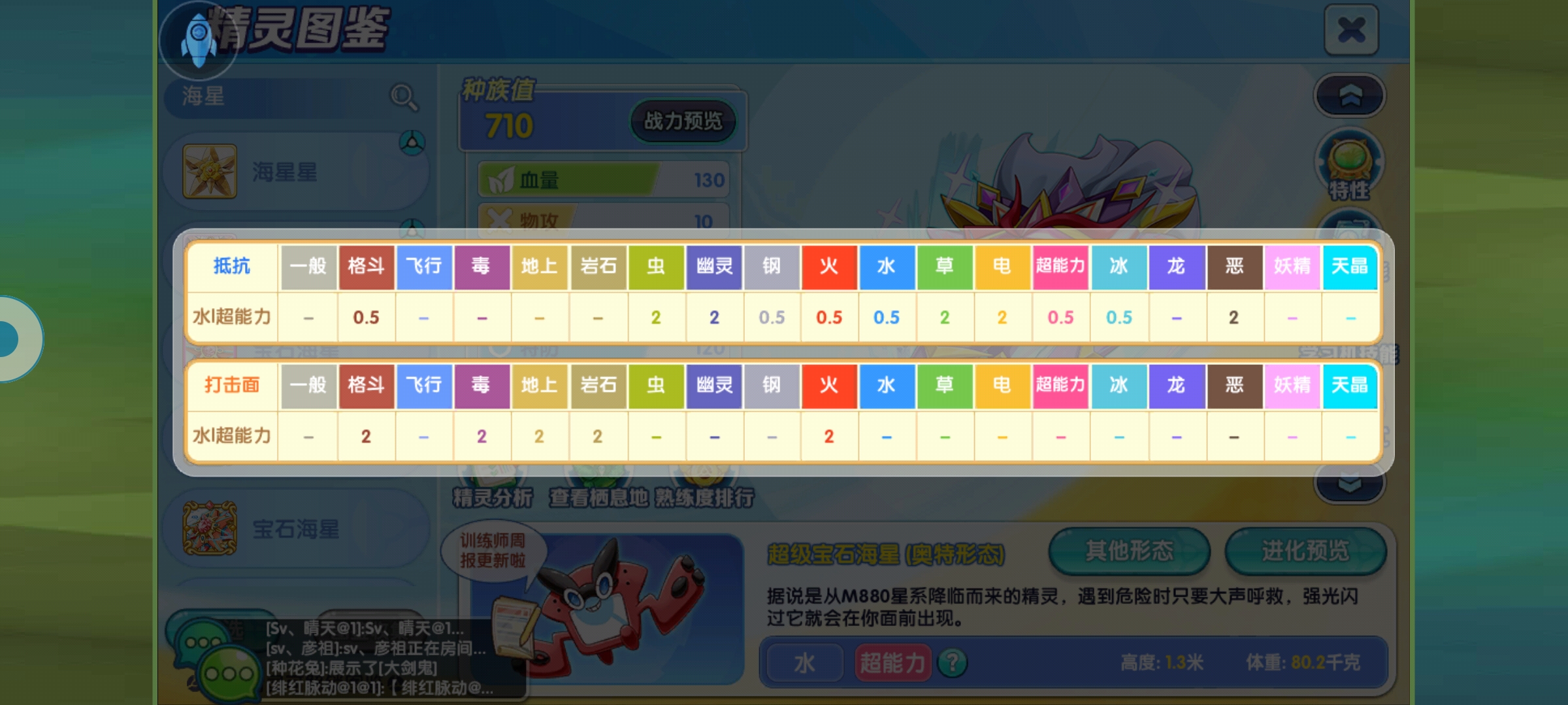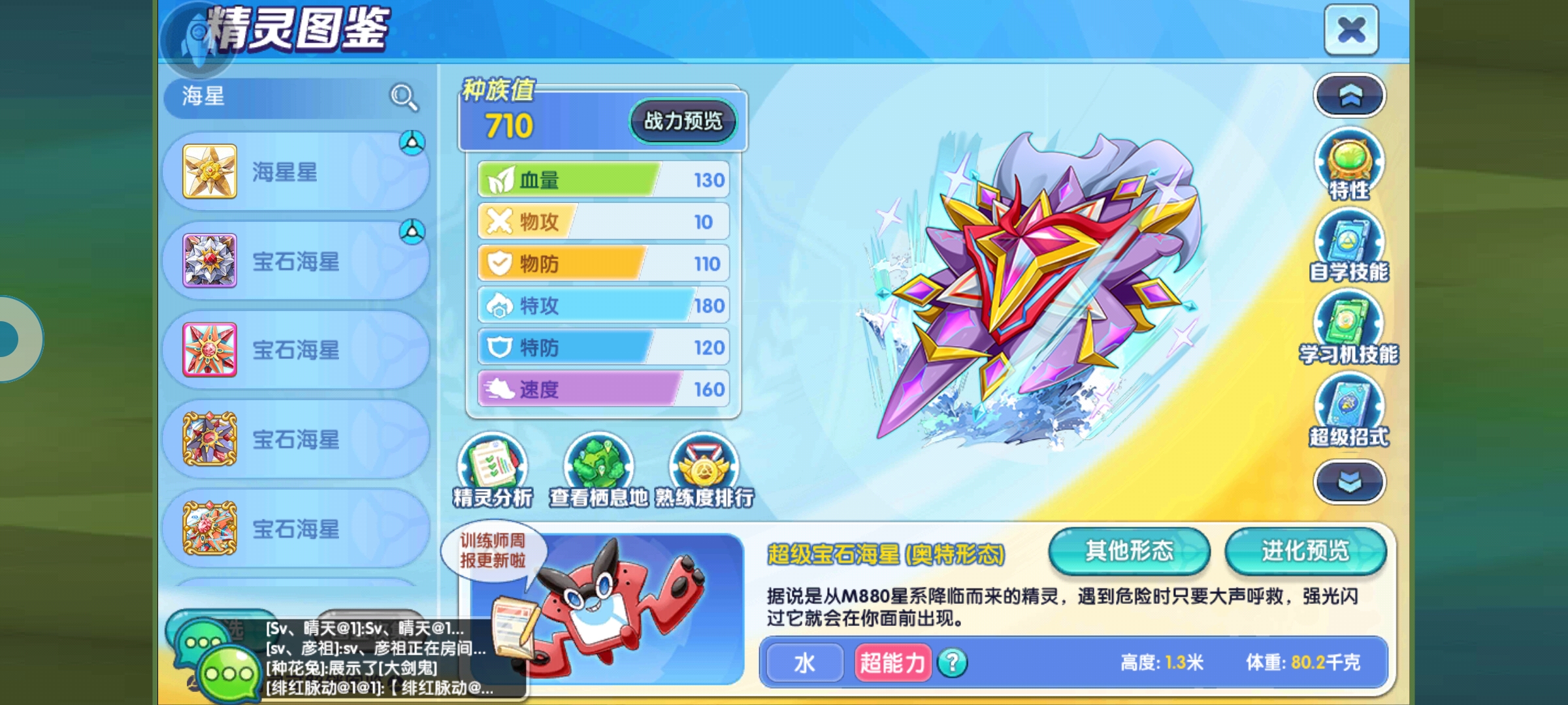 这个种族总和710,物防上面110还不算很肉,主要是在奥特宝石海星赖以凭借的速度和特攻上面很不错,100的特攻水平目前版本来说也是比较突出,160的速度稍微有点够不到第一梯队,但是可以凭借队友加持,比如火猪也可以快过,配风火轮猪或者手动大岚,肉度还可以,较高的特耐120也扛不住目前版本各种怪物的狂混乱炸,而且奥特宝石海星的强大还真不能在面板上体现,因为还有奥特能量给它的各类加成。