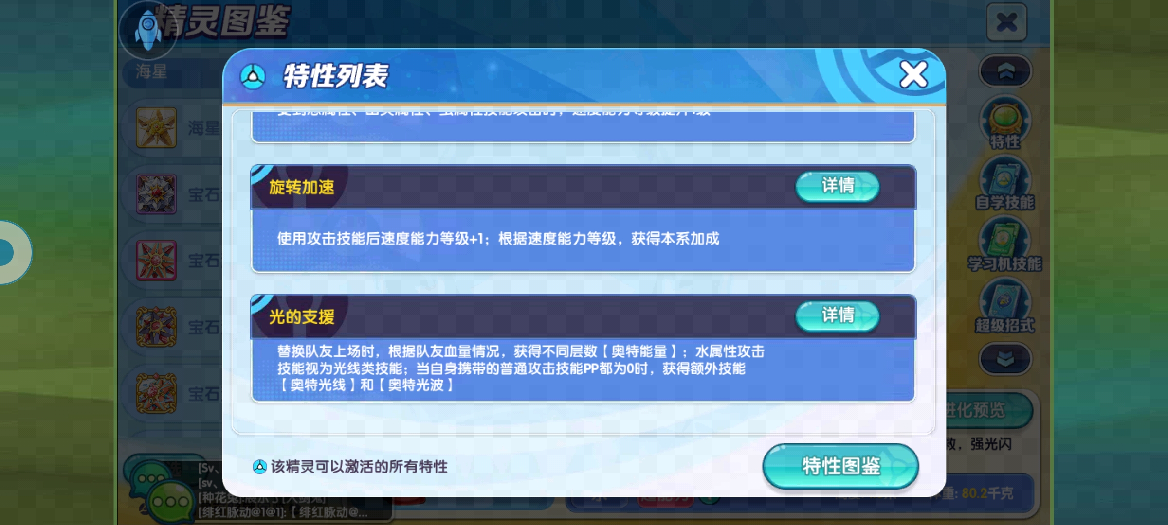 特性有多个,不过当然开专属特性光的支援。效果是替换队友上场时,根据队友血量情况,获得不同层数奥特能量,水属性攻击技能视为光线类技能:当自身携带的普通攻击技能PP都为0时,获得额外技能奥特光线和奥特光波,替换离场的队友每损失1/10最大血量,则获得1层奥特能量,即替换的队友损失95%最大血量时,自身上场获得9层奥特能量;替换濒死队友上场时,获得10层奥特能量,奥特能量效果是造成伤害提升30%+奥特能量层数*5%,受到伤害降低4%*奥特能量层数,使用普通光线类技能时消耗全部PP,技能威力翻倍,每回合层数-2,离场时清除。
