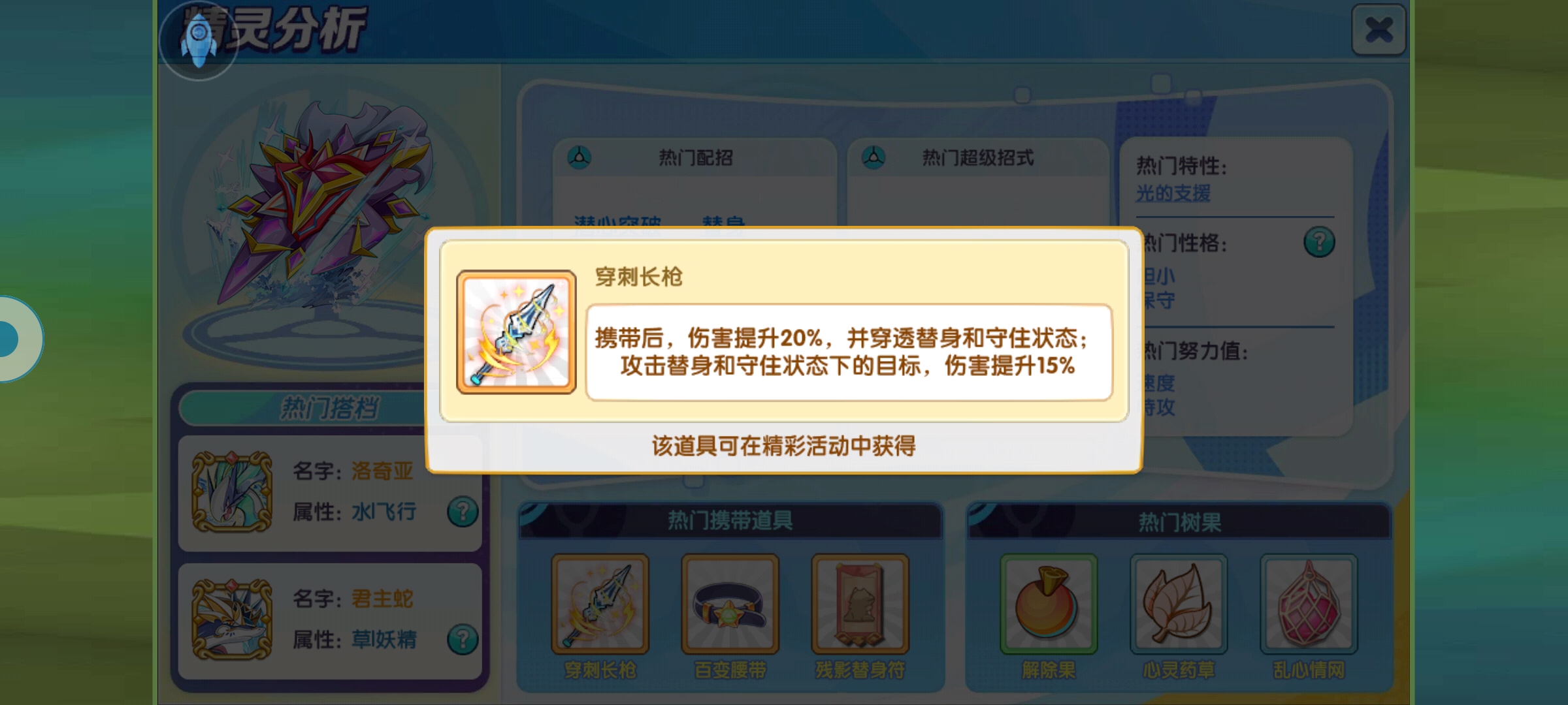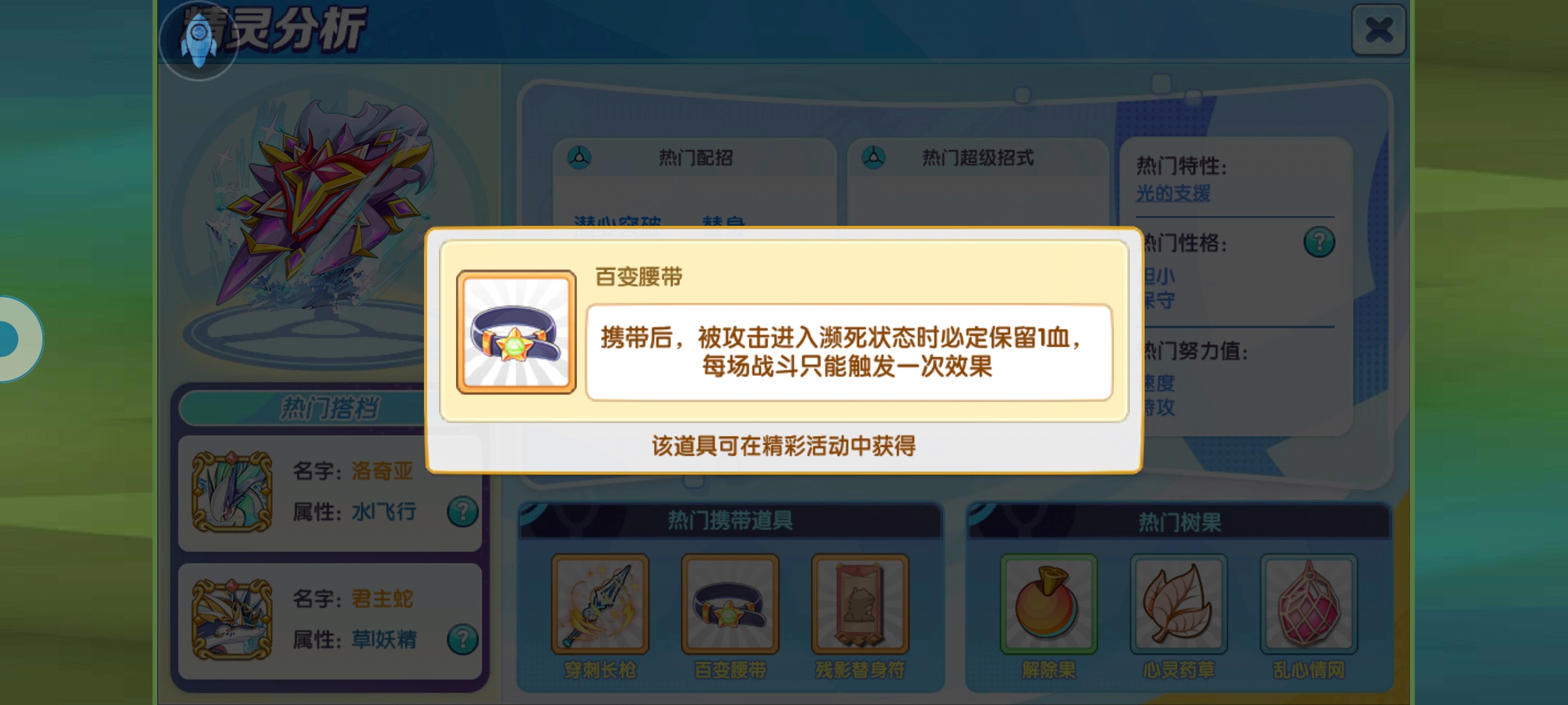 还有可以配合替身缩小带保命的一些道具,增强容错率还可以携带腰带,如果腰带那么携带树果可以使用奇迹果或者沙鳞果,这两个都是免费果实,非常适合它,当然也可以选择诱爆果或者诅咒果。