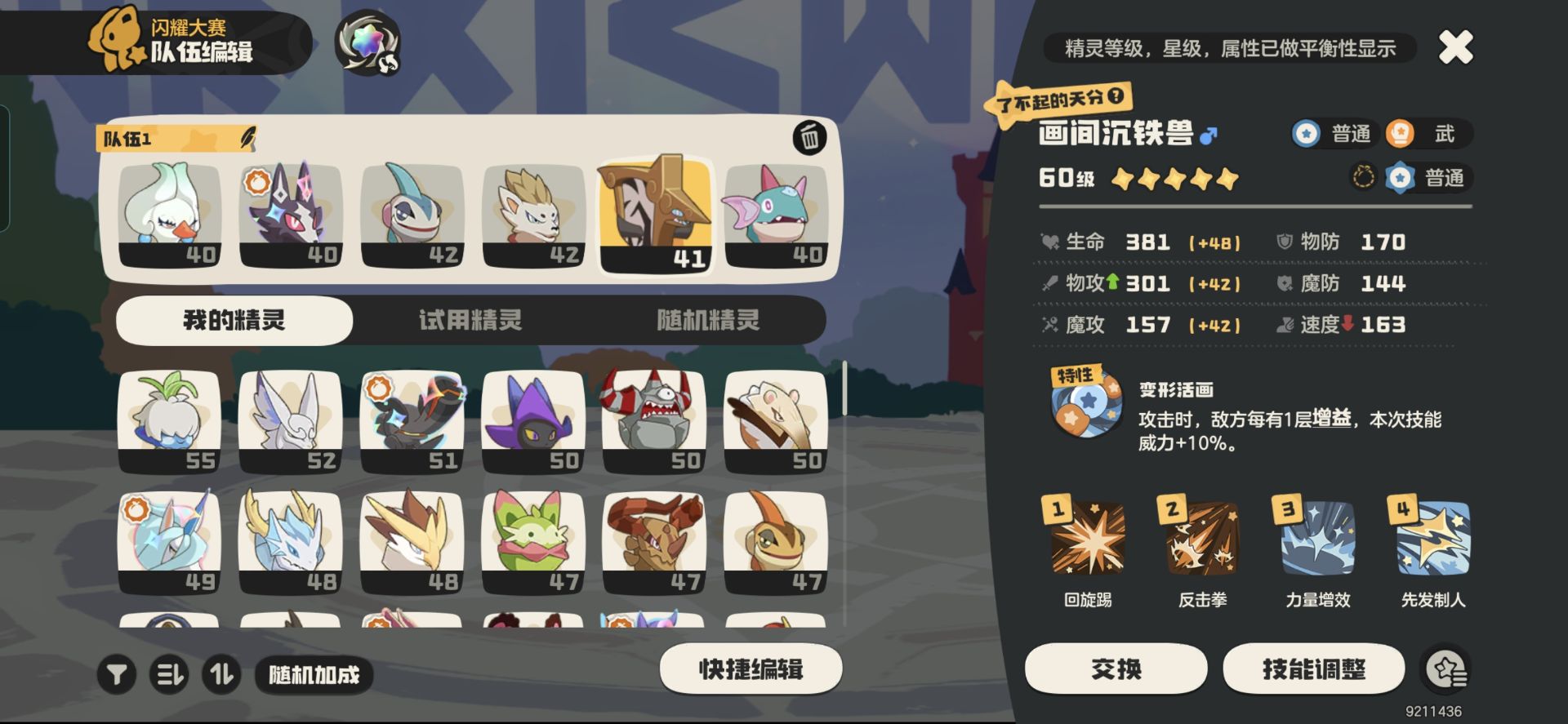 一拳兽特点是敌人有1层减益,伤害威力就可以提升10%,配合冰卡瓦重+音速犬这种可以给敌人叠减益的精灵,一拳上场基本可以做到轻松瓦解敌人。