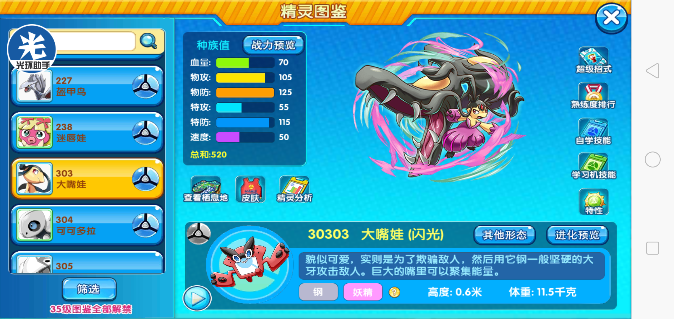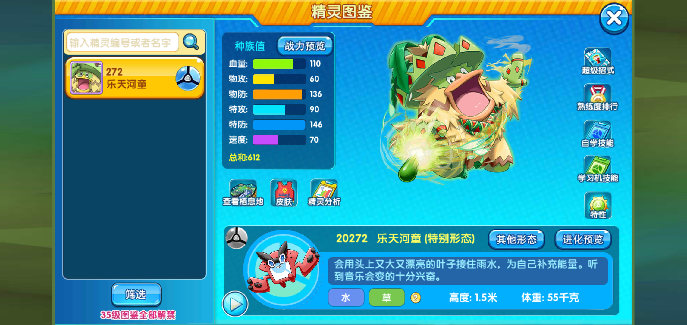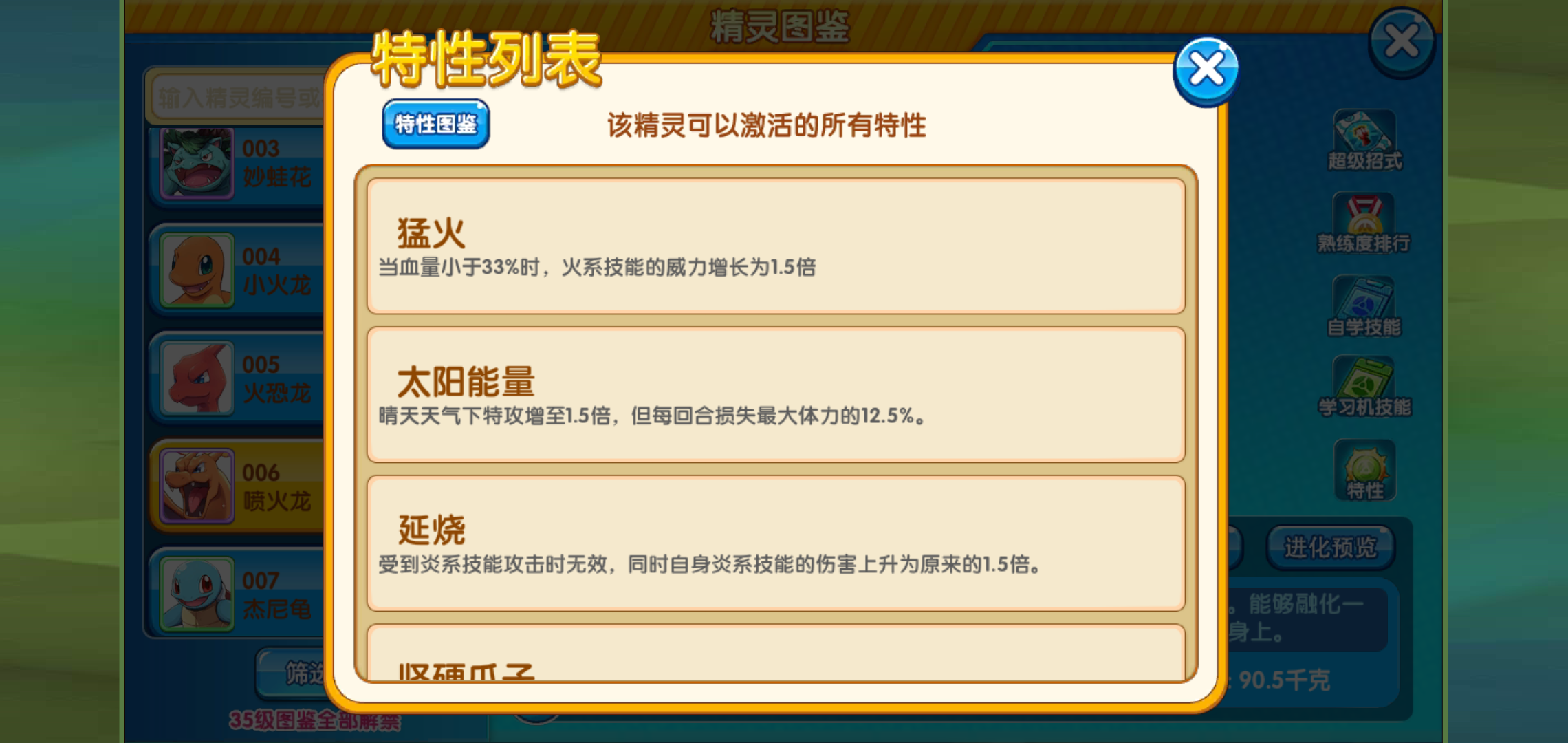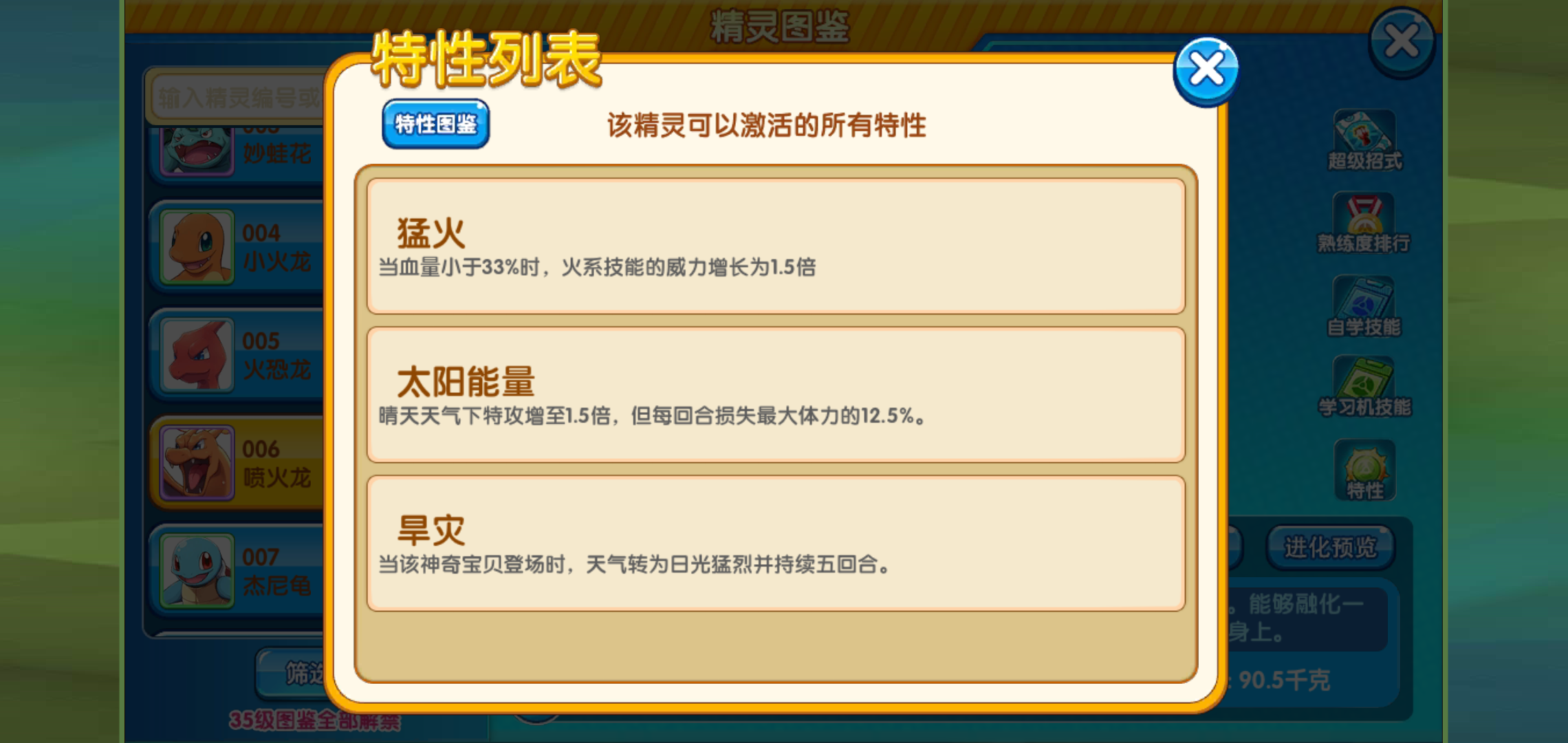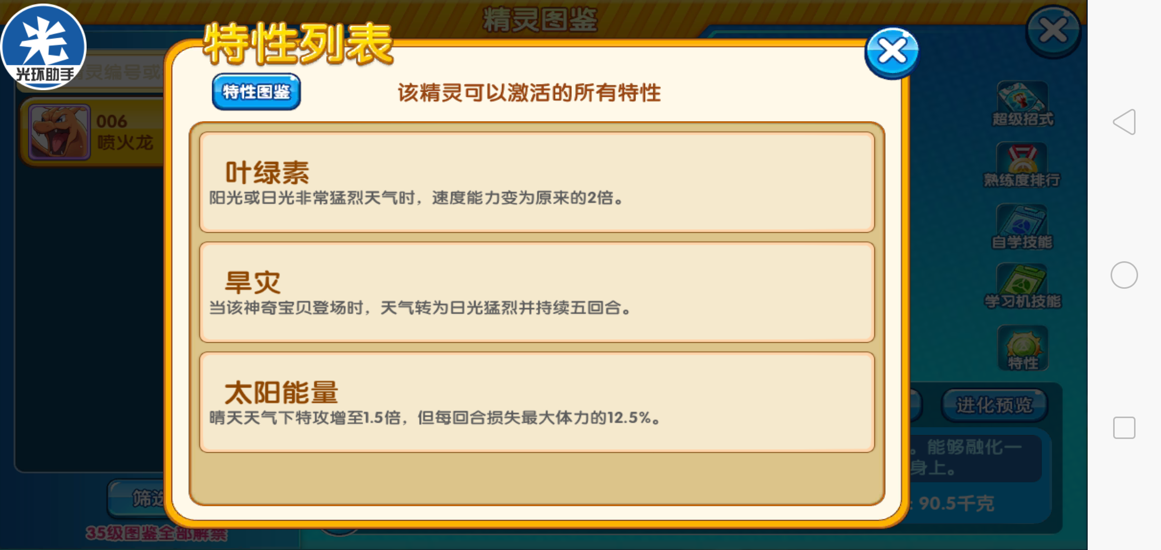 在特性方面我还是推荐旱灾打法,增加火系攻击。不过还有一种打法,但是需要一个开天气的宠物,那就是激活叶绿素,找个宠物开天气,这样他的速度翻倍能超过很多宠物,加上攻击彪悍能够干掉很多宠物。