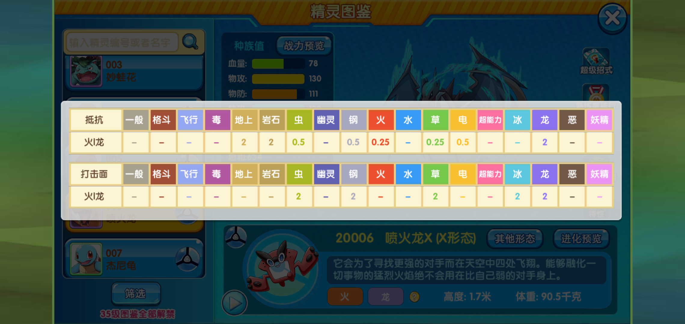 总结:喷火龙无论什么形态血量永远是他的短板,对战的时候要注意血量,自我感觉x>∑>y ,为什么x比较好呢?因为x的抗性比他们2个多,其次x不怎么依赖天气并且x的双防比较高,如果有天气的情况下肯定是∑要好,但是如果∑没有天气就已经废了一半,因为他的双防很低身板很脆,估计克制的技能一下子就差不多死了,并且缺少回复能力。