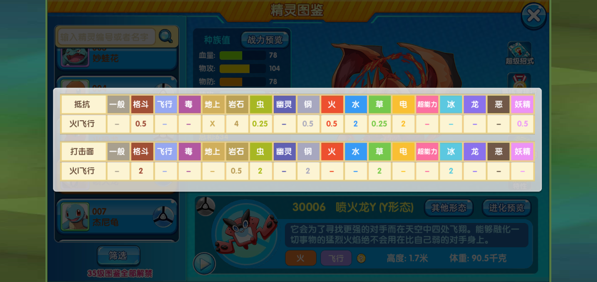 他的属性火飞,相比x少了地面,龙系的克制,多了水,电系天敌。在抗性方面要比x要好多了格斗,妖精这2个系的双倍抵抗,在虫系的上面很更上一层楼达到了四倍抵抗。相比火系减少了一半抵抗,岩石系更是达到了4倍克制,看来遇见岩石系一定要跑喽。
