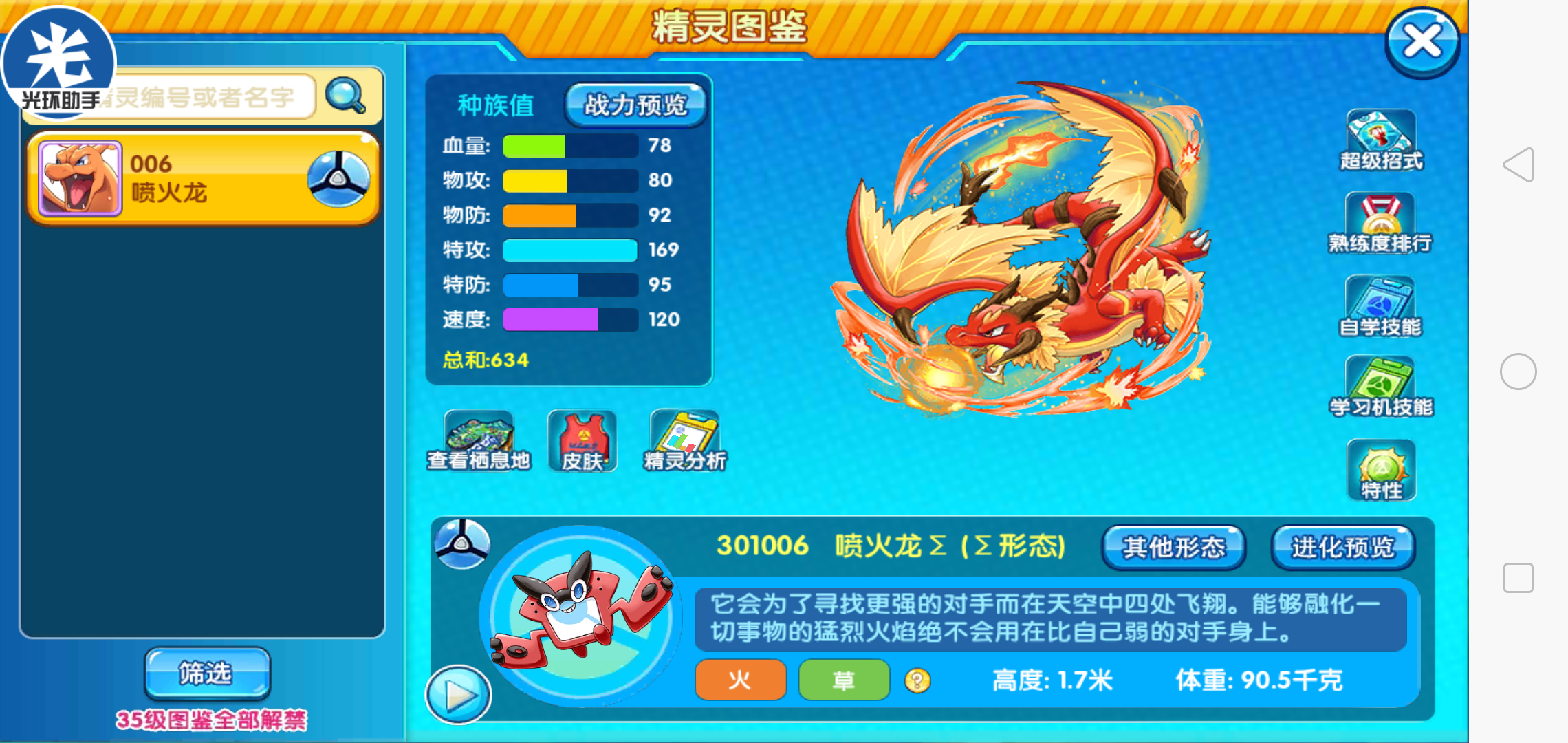 睡觉是喷火龙∑唯一的回复技能;喷射火焰加上天气让伤害更高;阳光烈焰克制水系,而水系不克制喷火龙∑,玩好他可以成为水系的天敌;猛毒可以给对面施加状态。