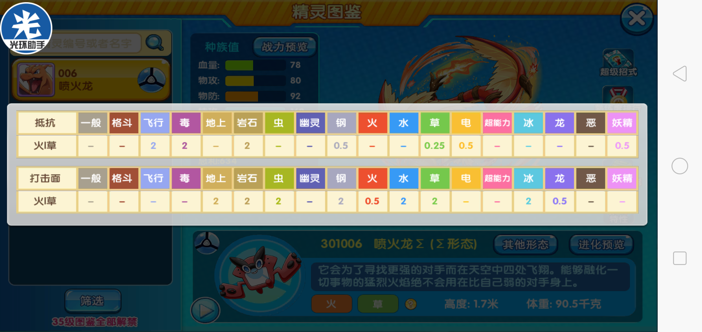 喷火龙∑属性火加草相比火系少了水,地面系的天敌但是多了毒,飞行系天敌。双倍抵抗钢 电,妖精系四倍抵抗草从表面上看抗性还是可以的。打击面上克制地面岩石虫钢水草冰,但是火系龙系是他的不足,身为拥有火系属性的居然怕火,这也是朵“奇葩”。火加草系可以抵抗妖精电系,正好可以面对偶皮这个宠物,只要偶皮不放异常喷火龙∑足以战撸偶皮。