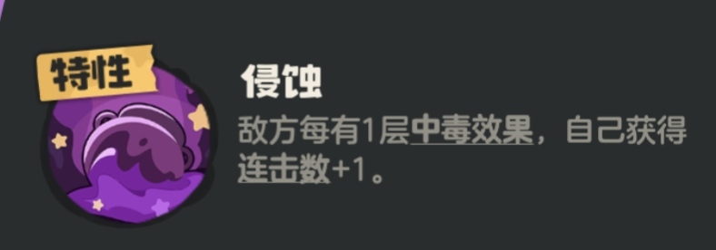 它的特性在于每带1个毒素技能,使用水技能后就可以让地方获得1层毒,所以一般都是带3个毒+1个水技能,可以叠毒更快。