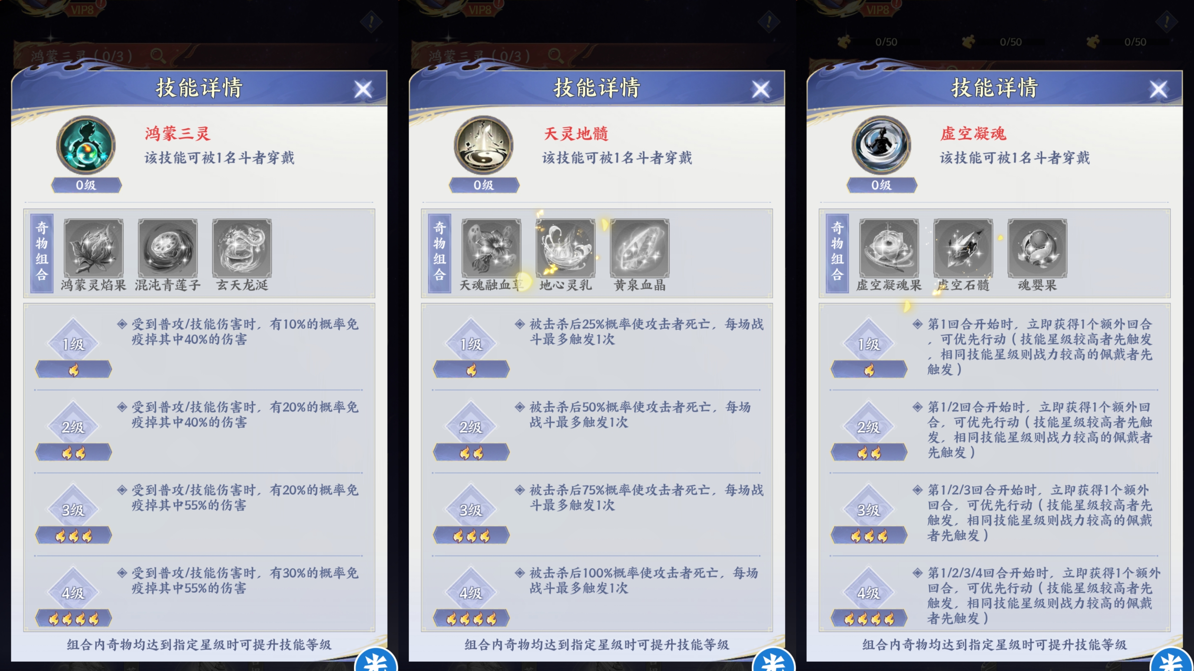 红色目前一共有6种奇物技能组合:鸿蒙三灵、天灵地髓、虚空凝魂、菩提悟道。