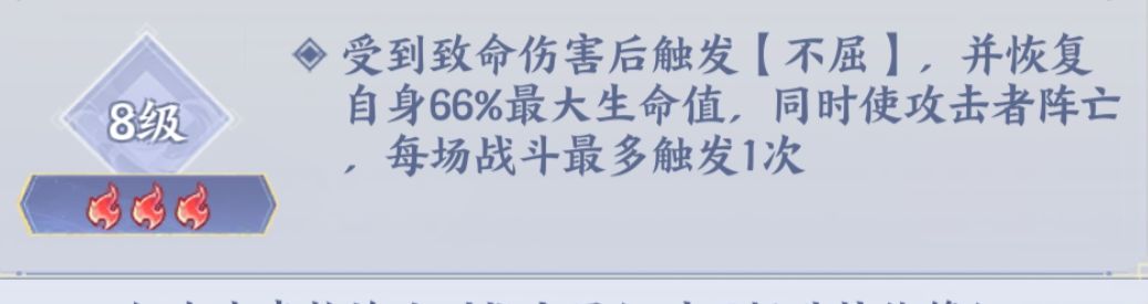 升到5星以后还有不屈+回血机制,受到致命伤害以后自己不死,反而可以让敌方的主攻手死亡,在pvp当中非常有优势,专打pvp的大佬可以考虑优先拿这个,不过这个【反死】机制没有带禁活效果,对面死亡以后还会被拉起来的