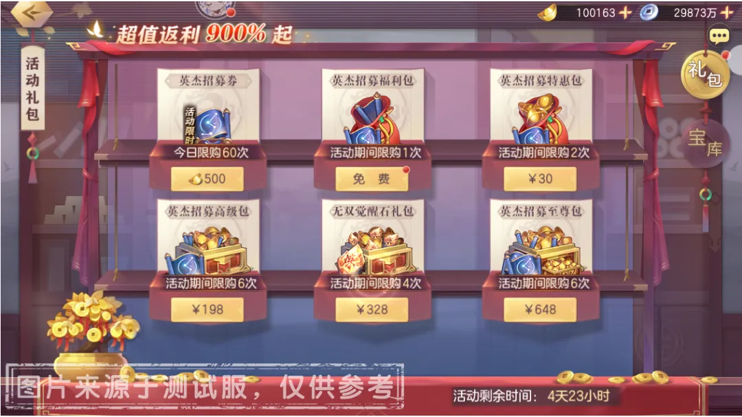 英杰招募至尊包:内含英杰招募券*60、元宝*6480,售价648元,活动期间限购6次。
