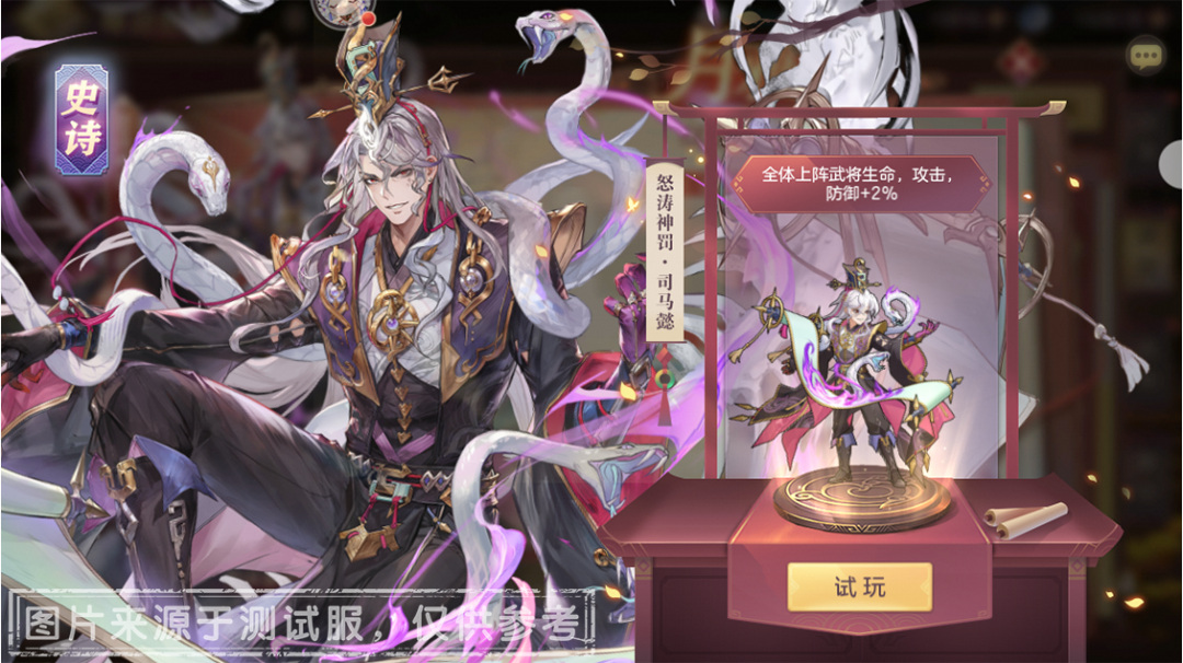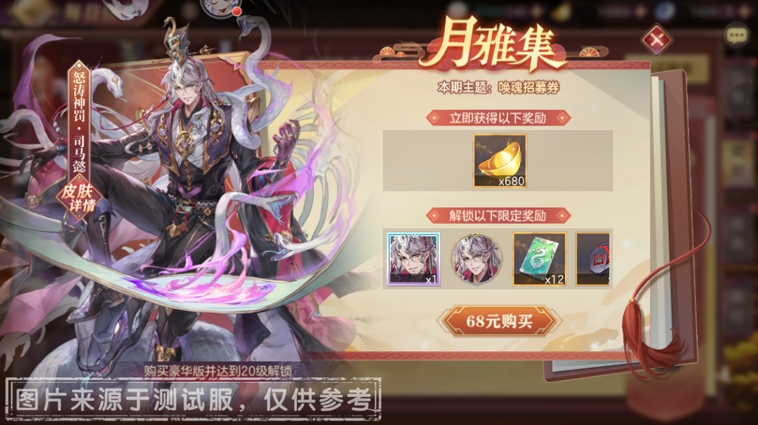 小将军可以通过每个月度完成“每日任务”获取月雅集进度,解锁“月雅集”标准奖励。另外,额外付费68元解锁“月雅集豪华版”后,达成指定等级可获得每月限定史诗级皮肤(本月为怒涛神罚·司马懿)、主题奖励(本月为唤魂招募券)等资源,助力小将军闪耀三国! 同时,本期月雅集皮肤返场分别为雨生百谷·诸葛亮、鸩羽风诛·高顺、楼兰公主·辛宪英、朝曙圣女·王异!