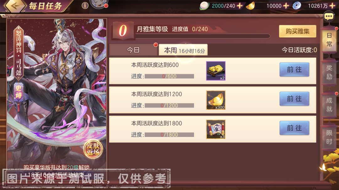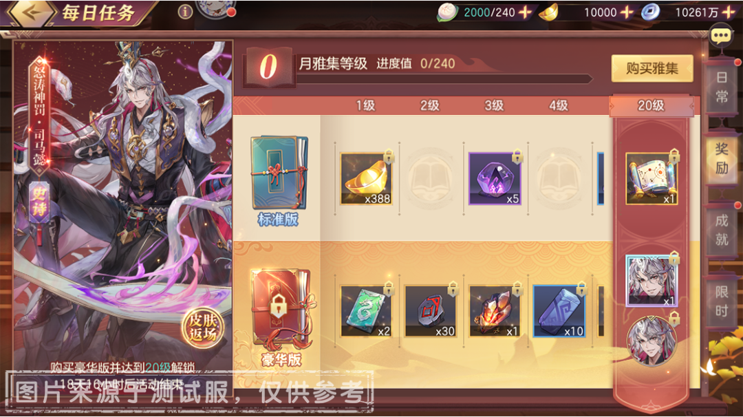 完成每日日常任务获得的活跃度将换算为月雅集进度,每获得240点月雅集进度将会提升月雅集等级,达到指定等级即可获得月雅集标准奖励。更有每月一款史诗级武将皮肤载入月雅集,68元付费解锁“月雅集豪华版”并达到20级即可特惠获取,还有本期限定招募券、海量资源等你来领!