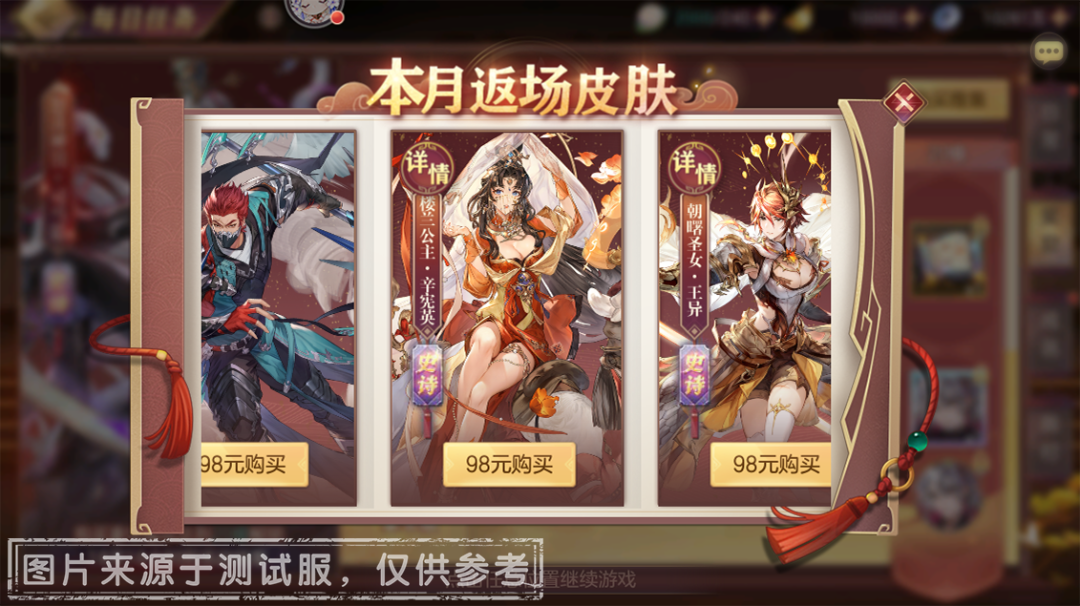 3.本期返场皮肤:雨生百谷·诸葛亮、鸩羽风诛·高顺、楼兰公主·辛宪英、朝曙圣女·王异