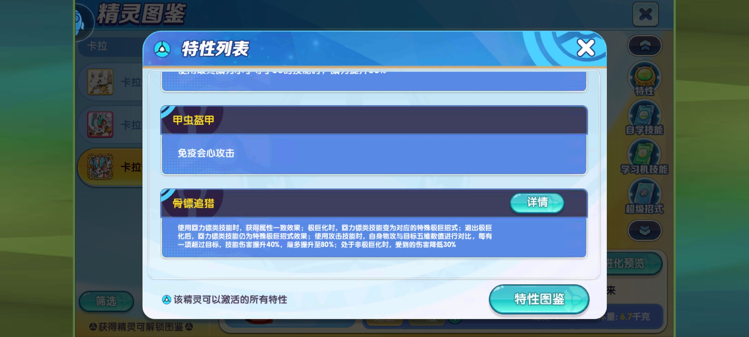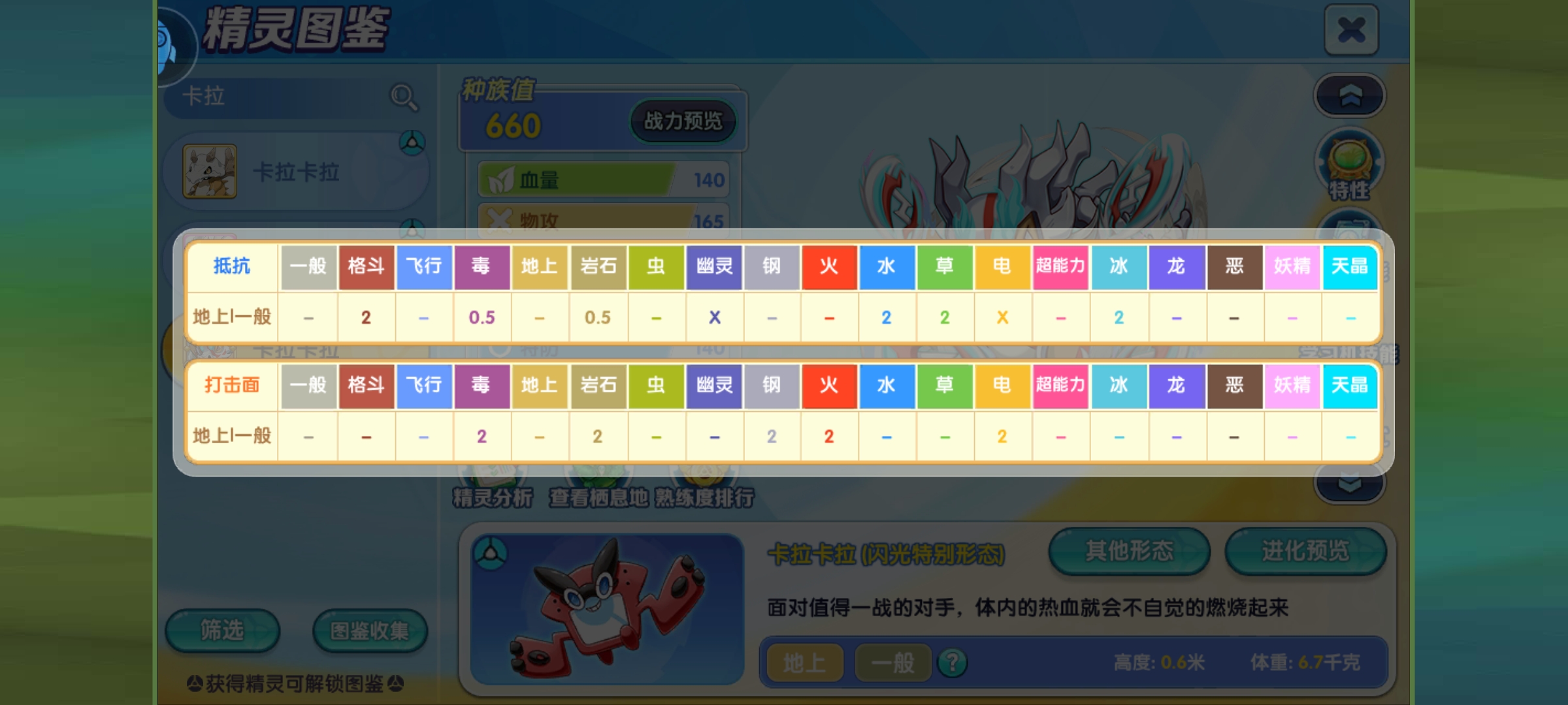卡拉卡拉的属性是一般系+地面系,和它的前辈属性都不一样,这个属性2倍弱格斗系、水系、草系、冰系,2倍抵抗毒系、岩石系。免疫幽灵系、电系,属性抗性还可以,不是特别优秀,也没什么可吐槽的,毕竟是兑换宠,主要还是利用队友骗术后进行输出,另外弱点虽然四个,但主流的就是水系和冰系,不过它身板太脆,不建议进行联防,它的特性给予回旋镖属性加成,也不用担心打击面问题,在当前版本中能够克制多种主流宠物。