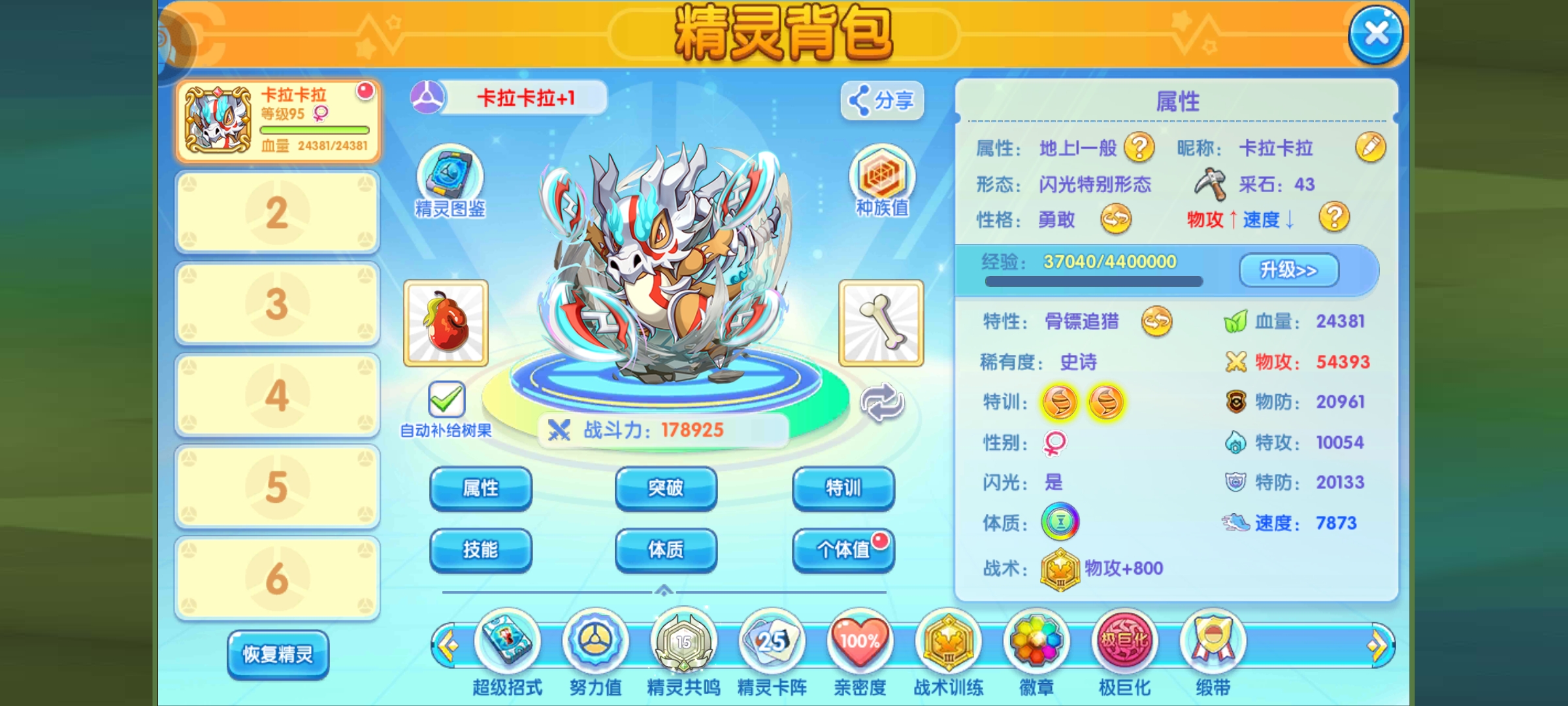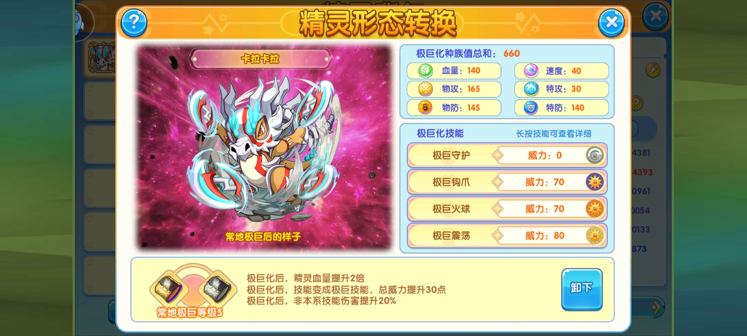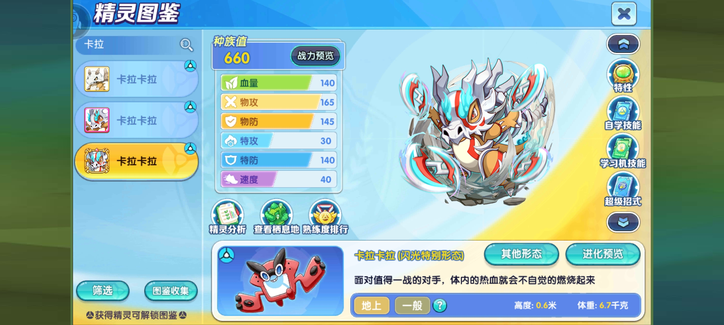 它的种族是武装系列签到里面分配算是中等的,看种族是个标准的低速输出宠,血量有140,物攻达到165,复刻平民宠里面也是比较一般的,但是可别忘了它的专属大骨头加成可是翻倍的,卡拉卡拉的物防也有145,特防140,配合血量肉度全是比较一般,用处不大的速度和特攻一共只分配了70点,相对于660的总体种族占比也较少,另外物攻是180配合特性和专属的的伤害加成下,还是非常可观,建议玩低速输出,最好还是配合骗术。