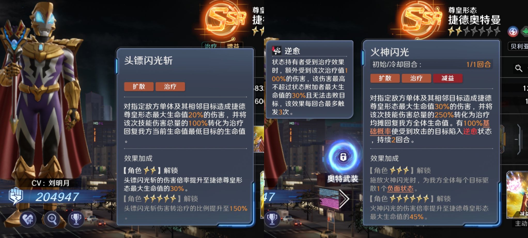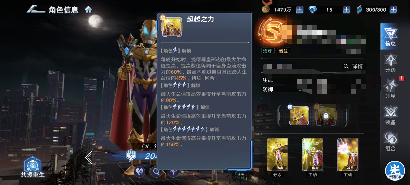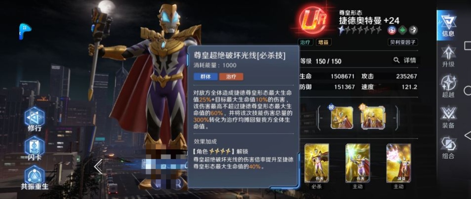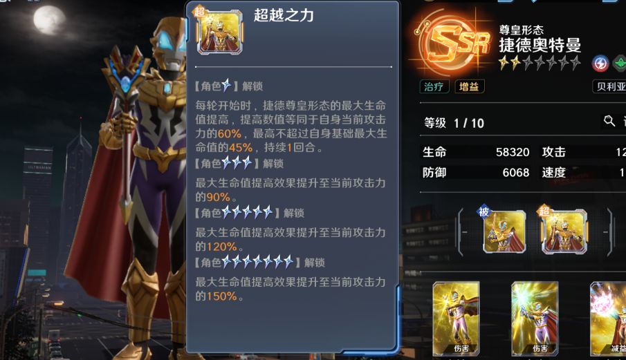 尊皇捷德的超越之力主要是每回合可以提升自身的最大生命值,提升比例是根据【自身攻击力】来算的。