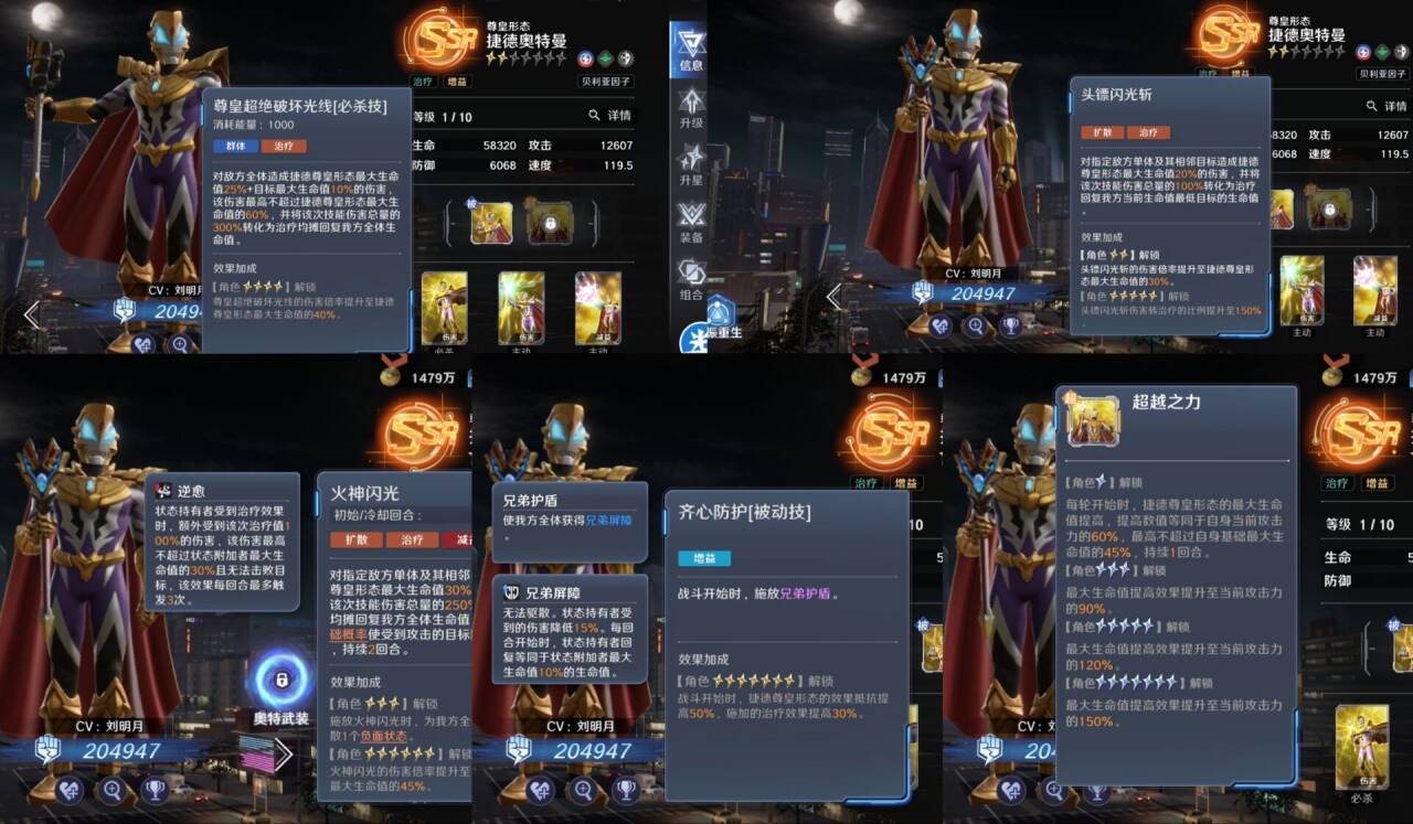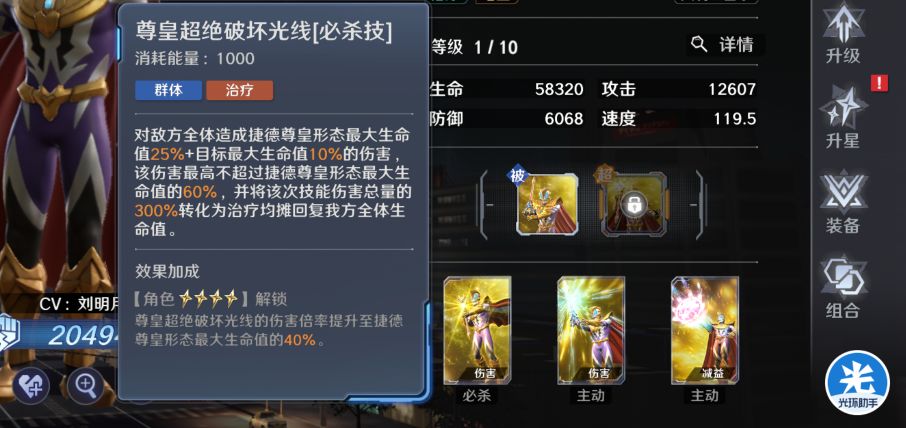 尊皇的必杀技和贝利亚一样都是最大生命伤害自身生命越高伤害越高,同时还附带敌方的最大生命伤害,这点就注定尊皇的伤害不会低完全可以充当队伍中的一个副c的位置。