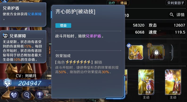 这个主动技能除了最大生命伤害和治疗以外,还能够让敌人受到我方100%治疗伤害,同时能够给我方全体队友驱散负面。