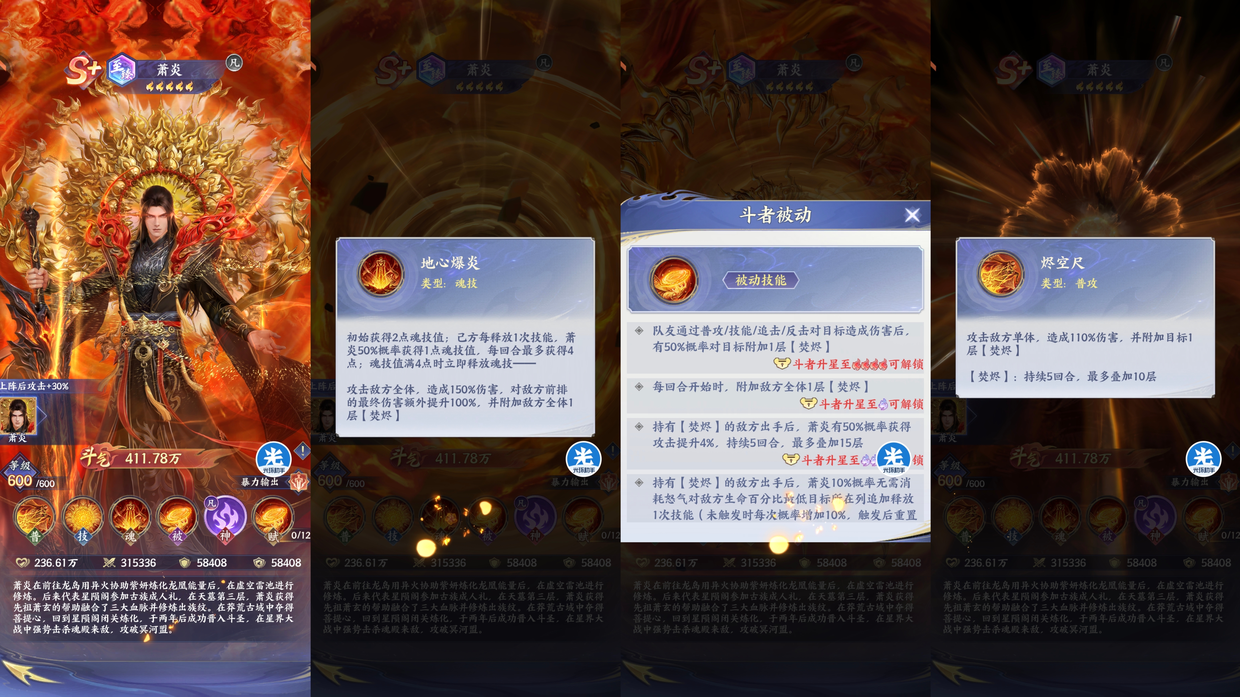 至臻萧炎可以通过【焚烬】增伤和提升攻击力同时在激活【丹境神魂】【天境神魂】【帝镜神魂】都是能够继进一步全面提升萧炎的伤害的,萧炎就是这个游戏中增伤最高最暴力的输出角色。
