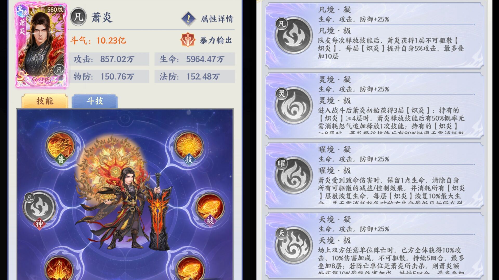 如果想让萧炎的输出最大化,在条件有限的情况下,狮子比较推荐大家升到【灵境神魂】