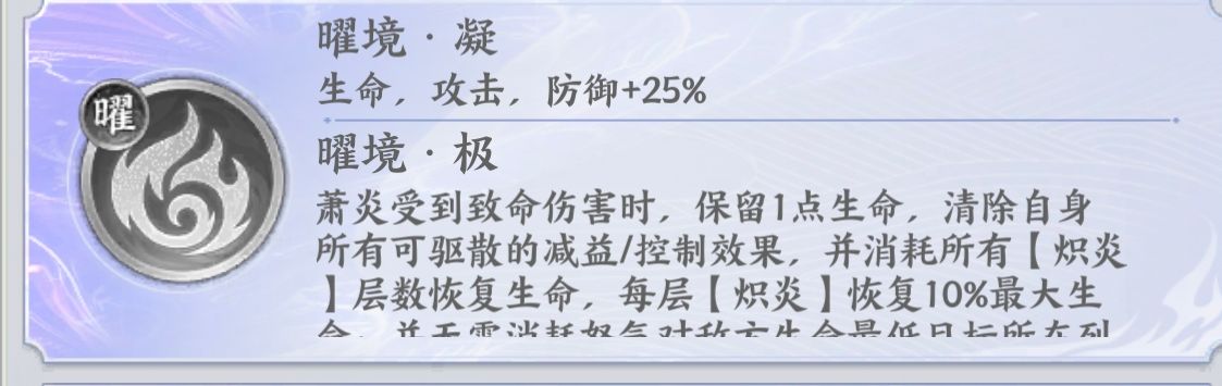 ⭐️然后【曜境神魂】是萧炎核心保命机制,受到致命伤害能够锁血保命,同时可以通过炽炎回血和增伤。