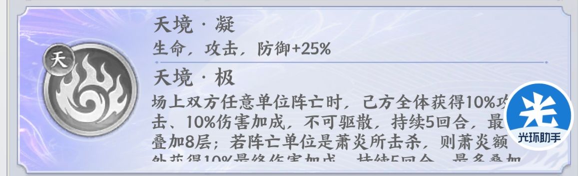 ⭐️【天境神魂】简单的说就是进一步提升萧炎的伤害,场上每死亡1名敌人萧炎都可以增伤,如果是萧炎击杀敌人可以获得双倍增伤。