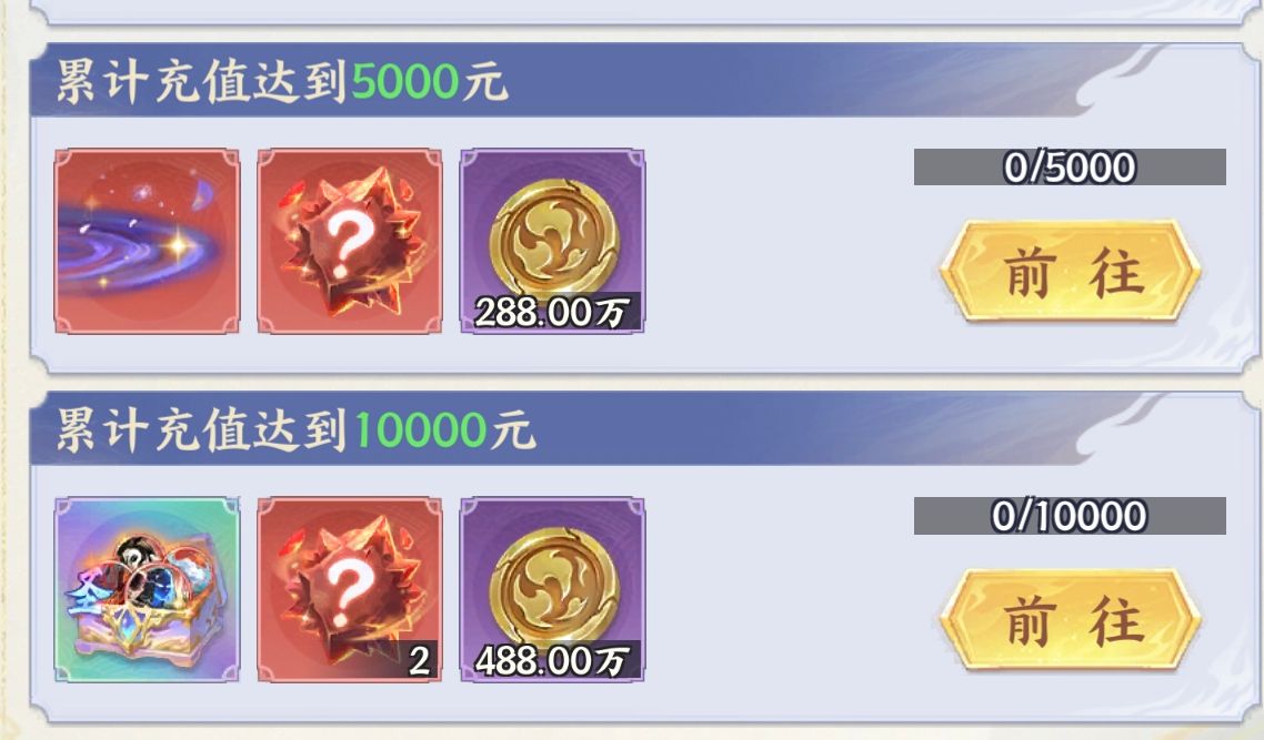 这个没啥好说的,就是给活动期间氪金大佬的福利,需要累充5000元以上才有比较好的奖励