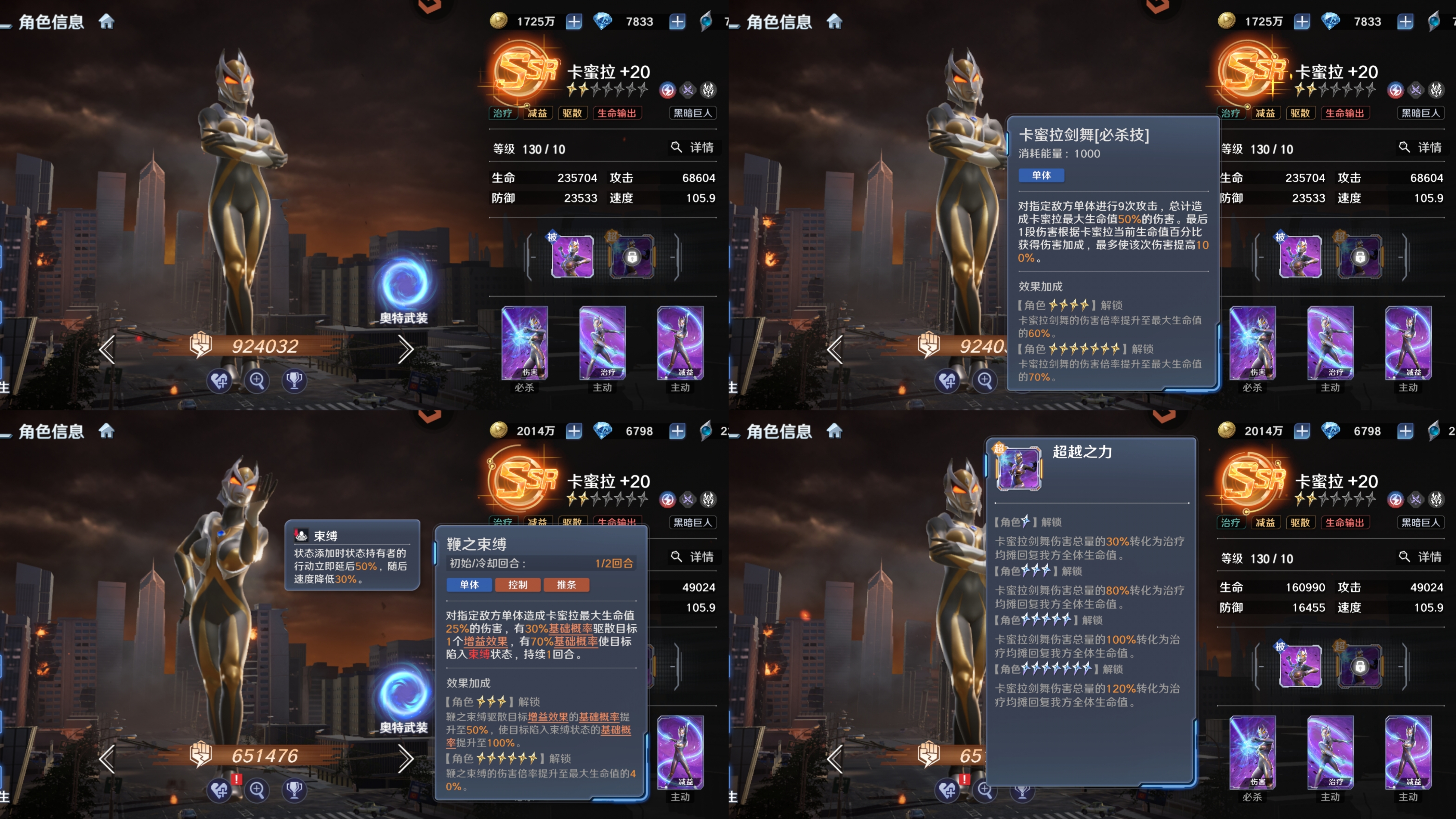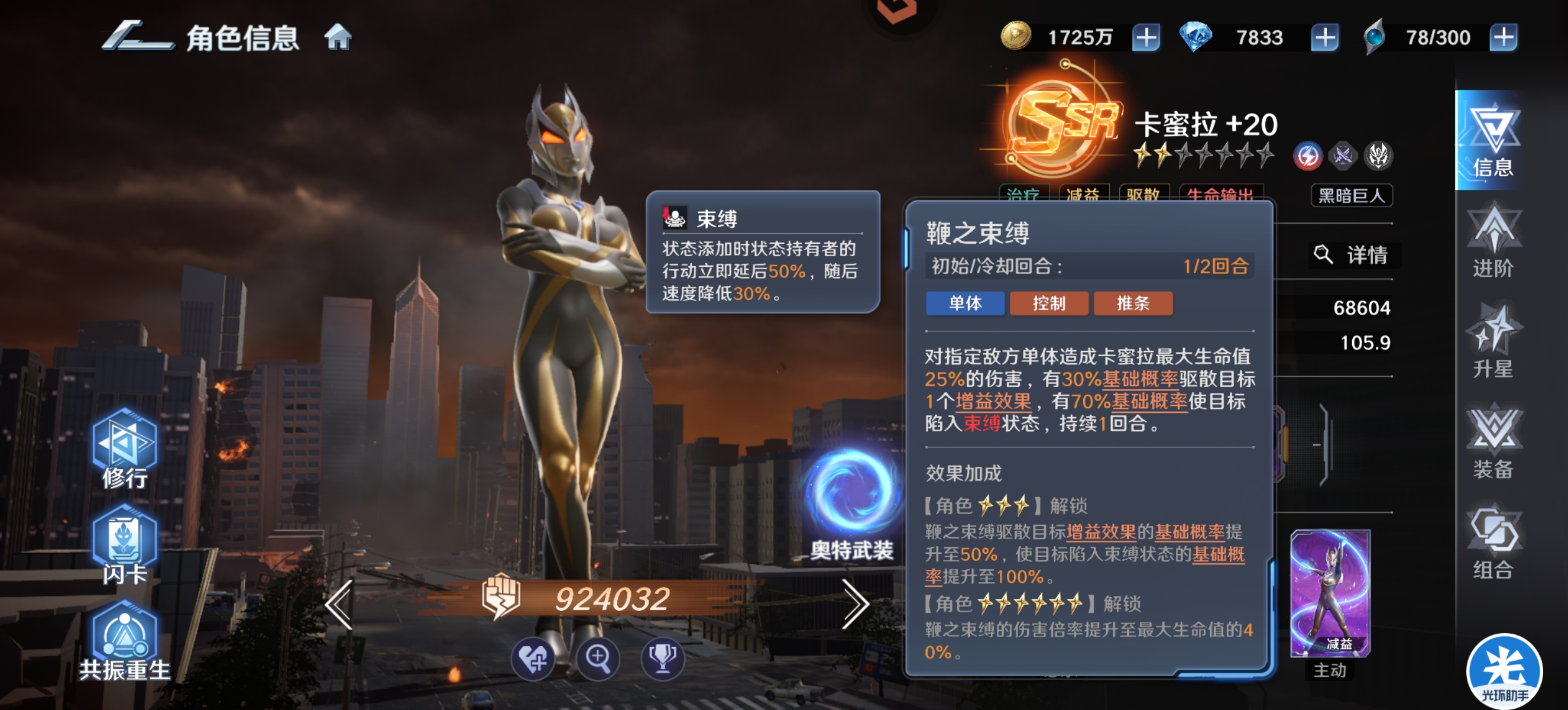 单体束缚:属于是可以降低敌人的行动条和速度,相当于就是降低敌人的先手,如果能够针对到敌方c位是比较不错的一个控制效果,但是实战中经常卡蜜拉先被秒了,束缚其实很难发挥出理想的效果,而且实战中就算放出来了,也不影响对面开必杀一套带走你。