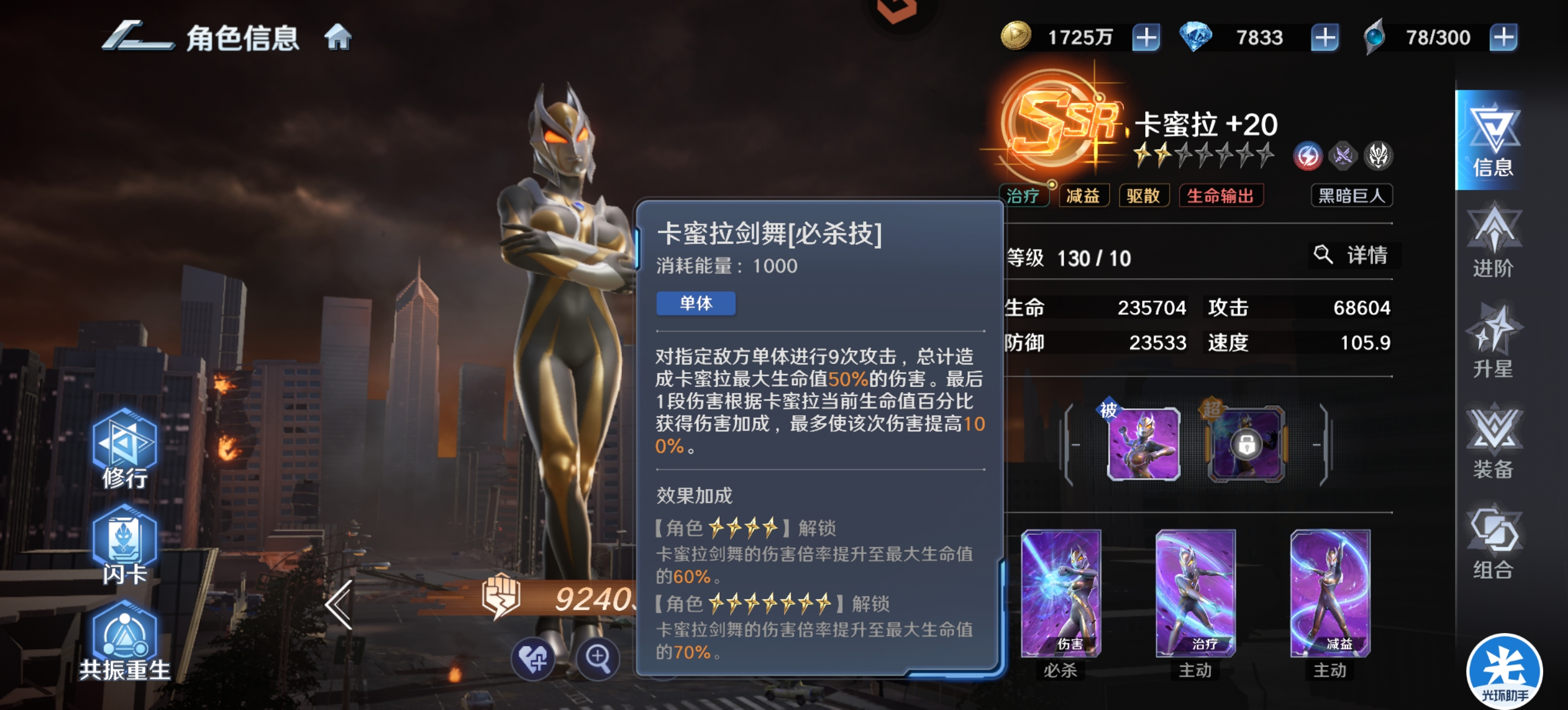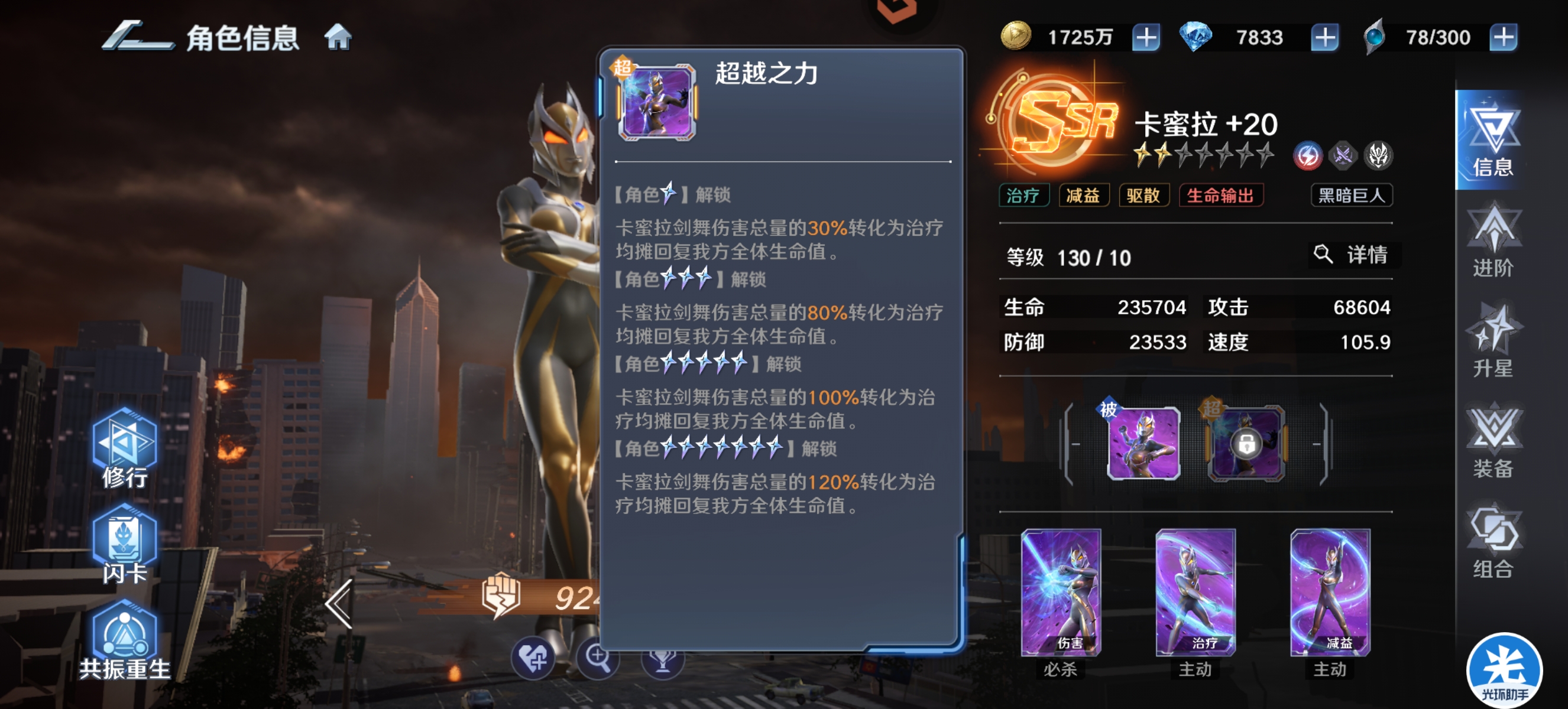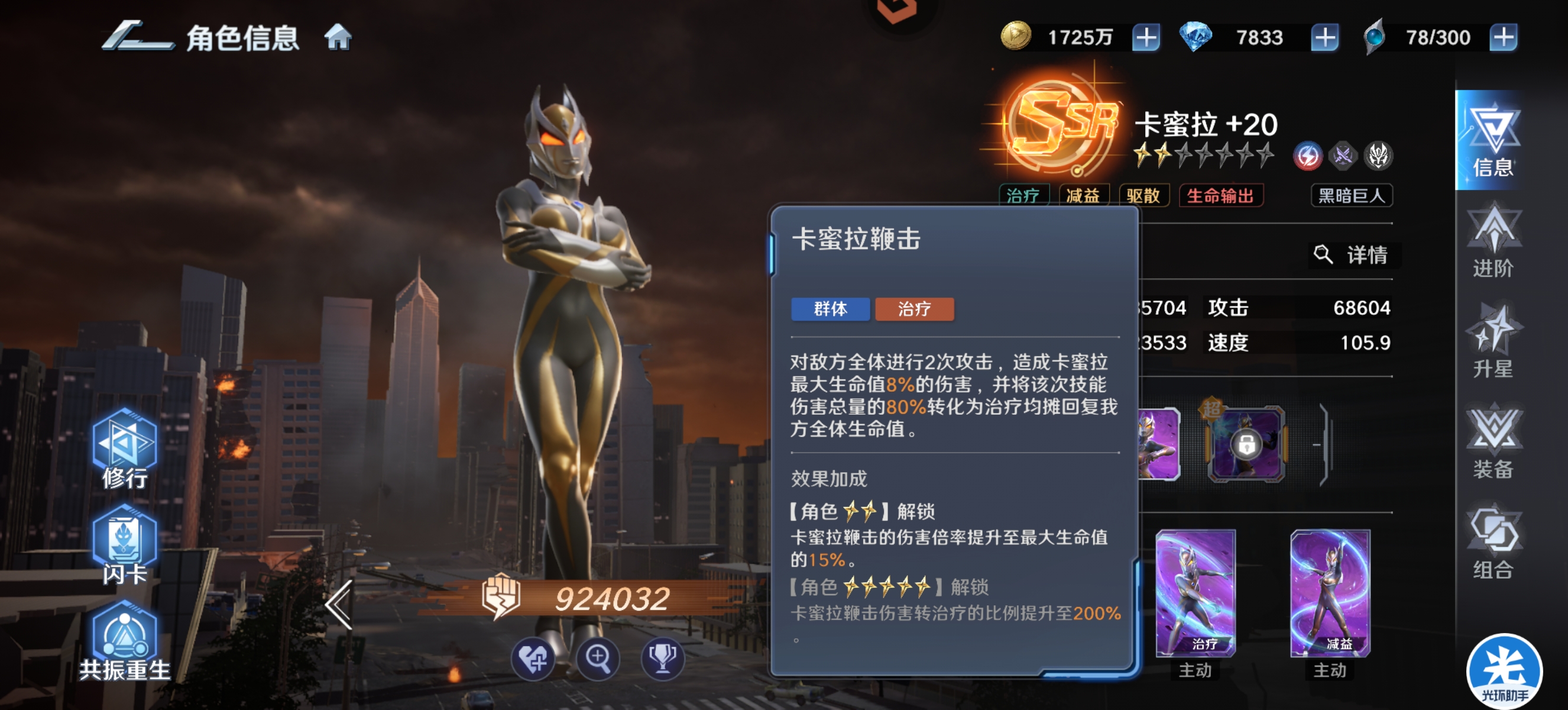 虽然原始捷德不能像卡蜜拉一样进场就可以提升队伍的最大生命,但是提升的上限是高于卡蜜的,在超越之后自身每损失20%生命最大可以提升队伍25%最大生命,而且可以叠加。