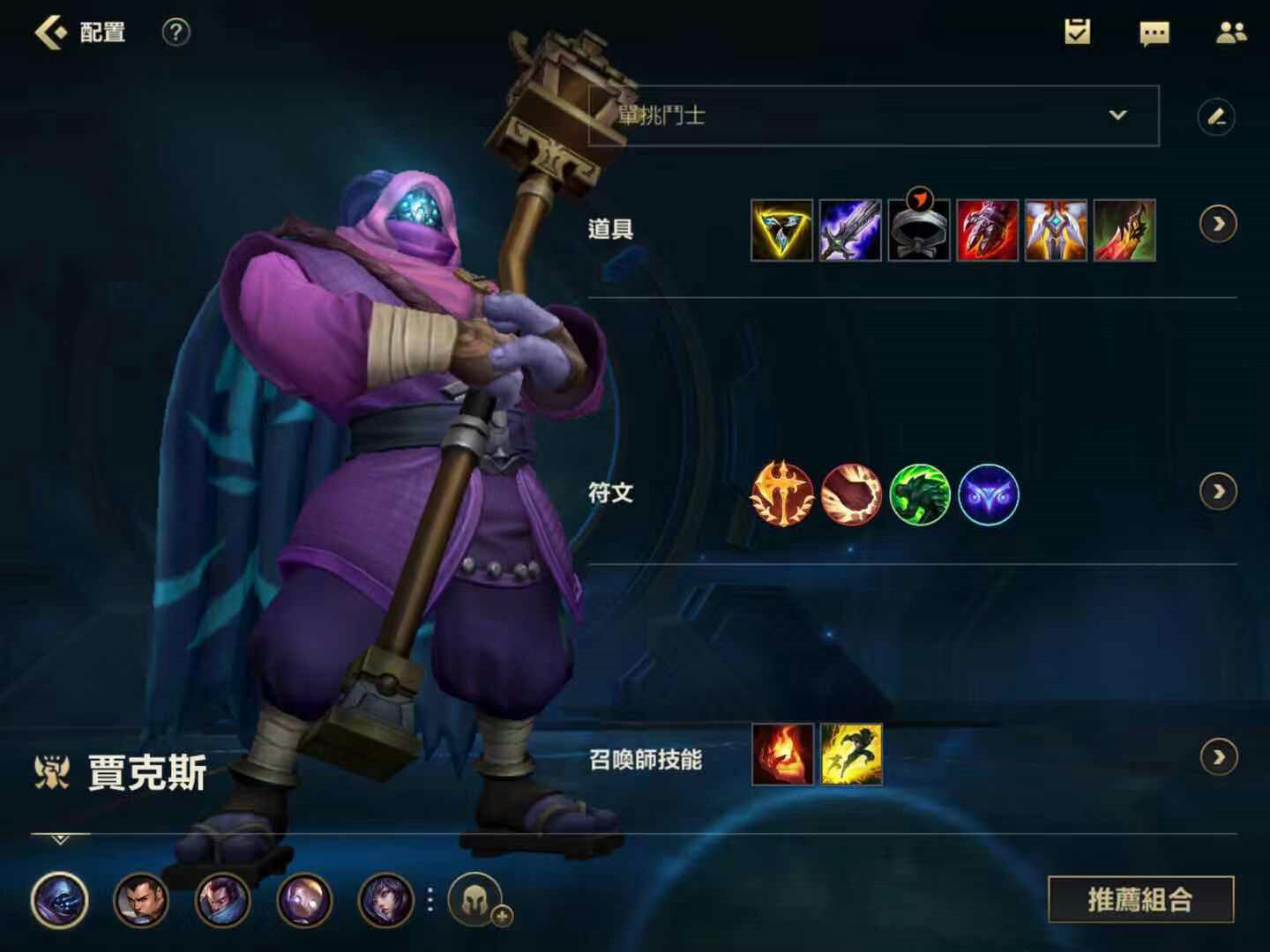 并且武器大师的主要输出手段是各种普通攻击。由于武器大师的q和w技能cd都很短,所以武器大师的核心武器第一件就要将三项之力做出来,完美契合武器大师的属性。然后作出鞋子增强跑线能力。然后就要作出破败王者之刃。增加恢复能力和单挑能力。可以让武器大师疯狂赖线。出了这两件装备后武器大师的伤害就已经很高了,随后需要补出血手增加坦度。再选择一件复活甲增加容错率,防止被集火秒。