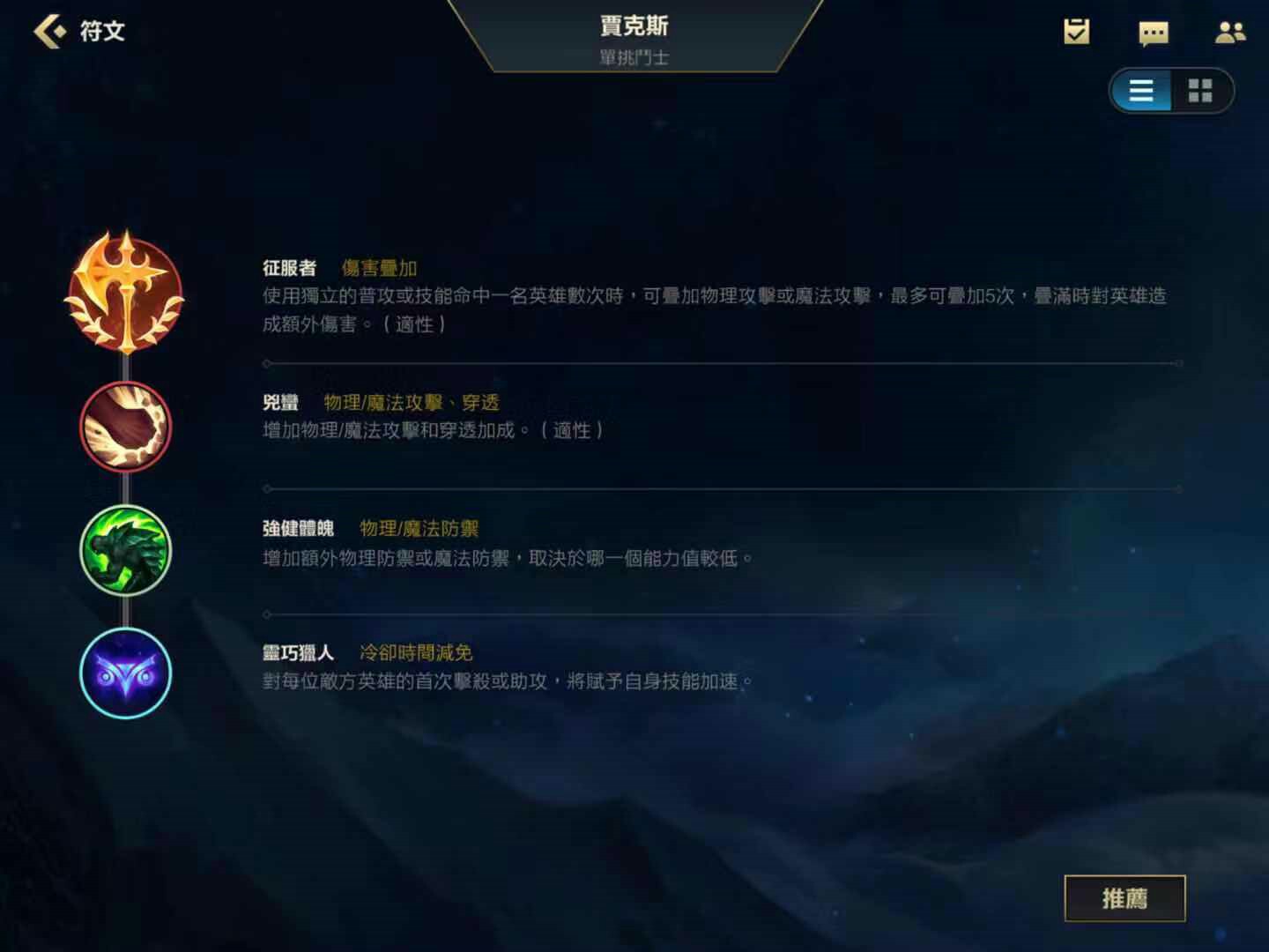 至于天赋方面。就可以选择征服者,可以增加攻击力和吸血。第二个小天赋选择残暴,可以提高穿透。第三个第四个的天赋选择泰坦杀手与猎人。